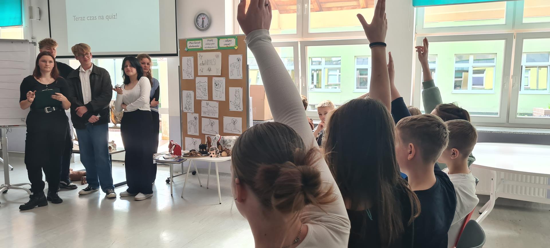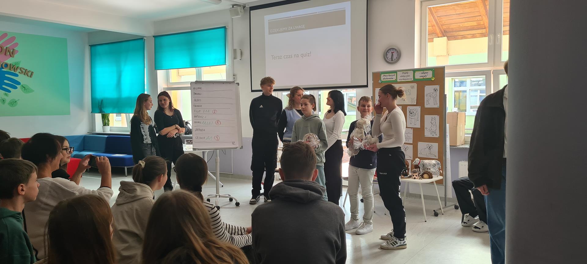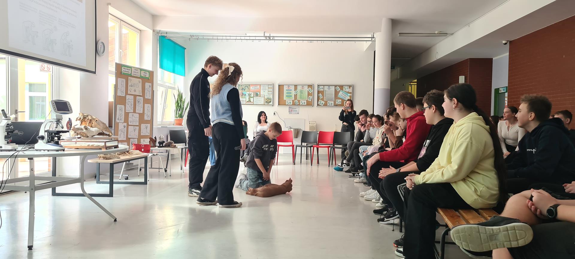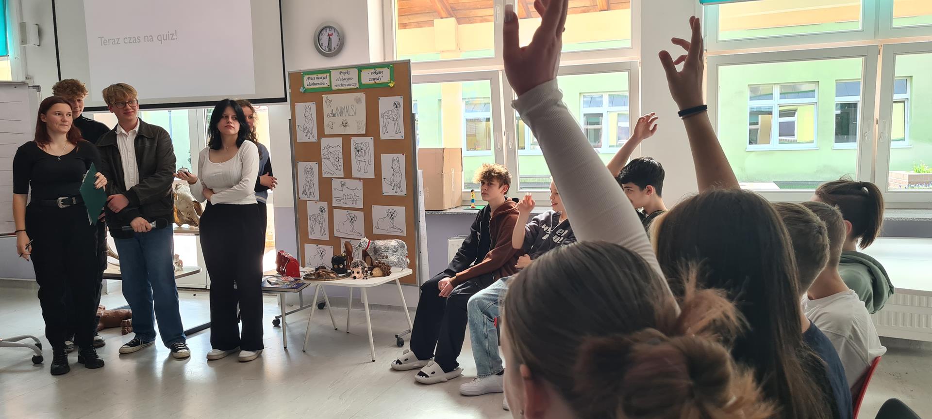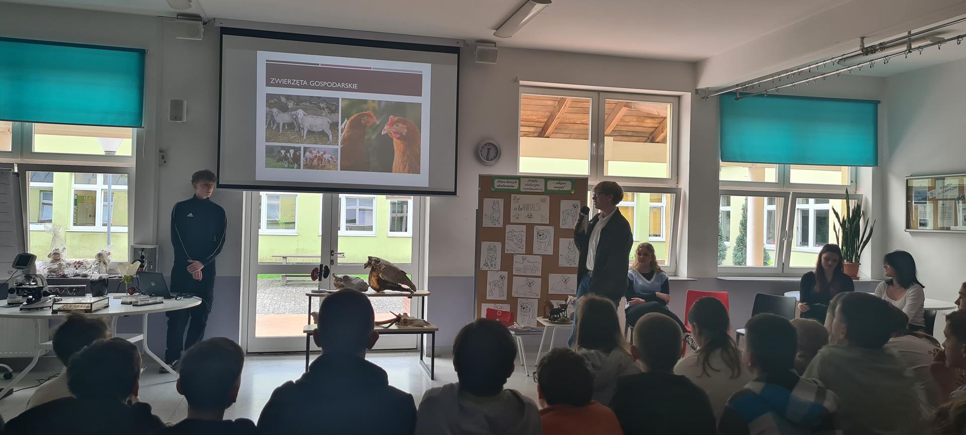 na fantomie psa jak należy prowadzić reanimację zwierzęcia. Dodatkowo zostało zaprezentowanych sporo rekwizytów jak kości czaszki konia, krowy, róg jelenia, zęby różnych zwierząt. Uczniowie mogli także zobaczyć przez mikroskop wiele ciekawych próbek tkanek, pasożytów. Na koniec został przeprowadzony quiz z nagrodami. Lekcja bardzo podobała się uczniom. To był prawdziwy sukces Eduanimalsów.