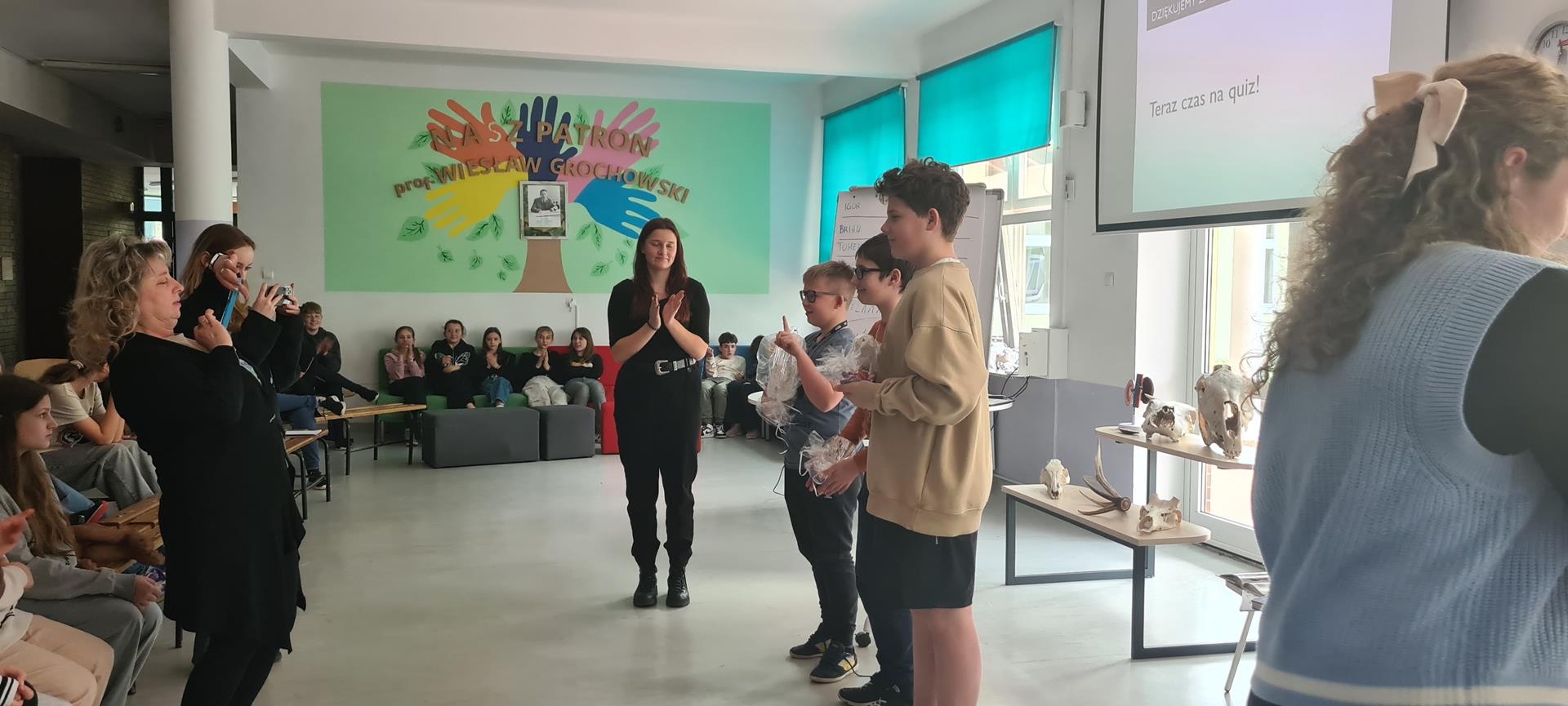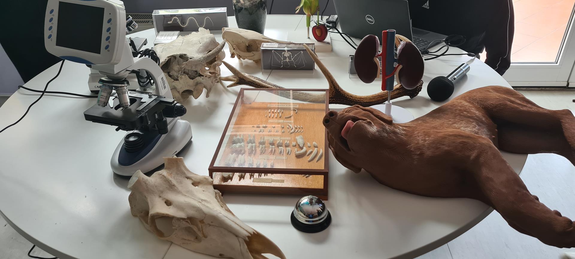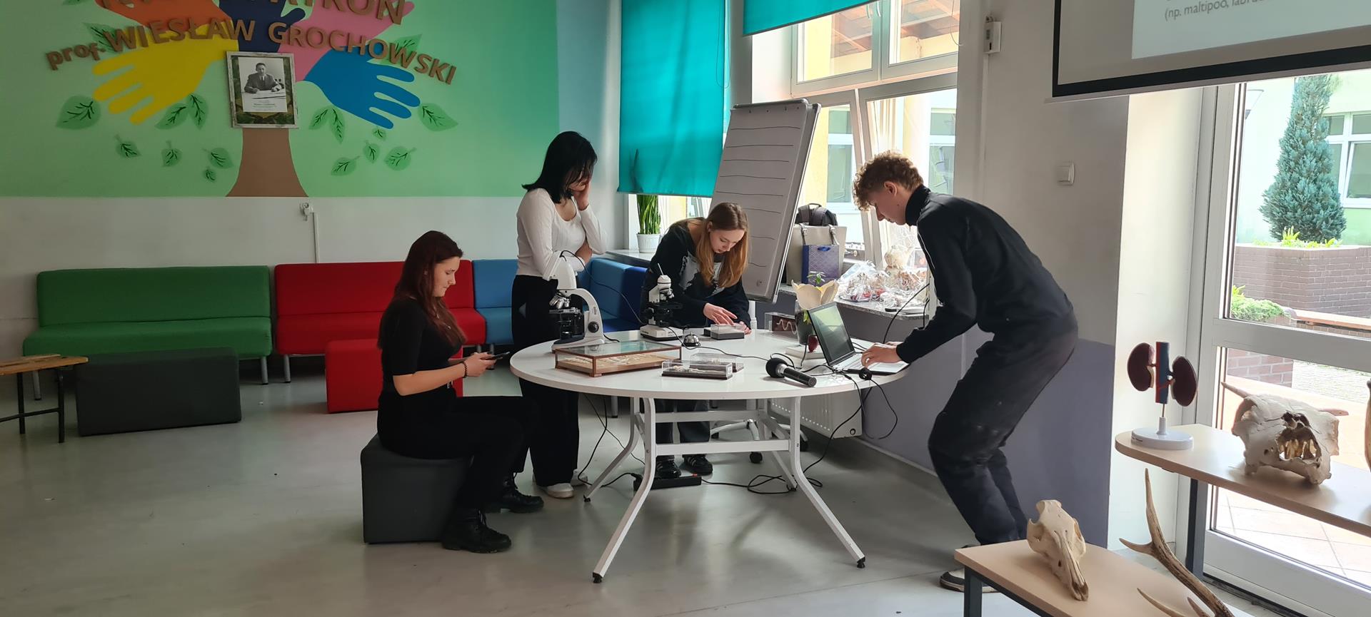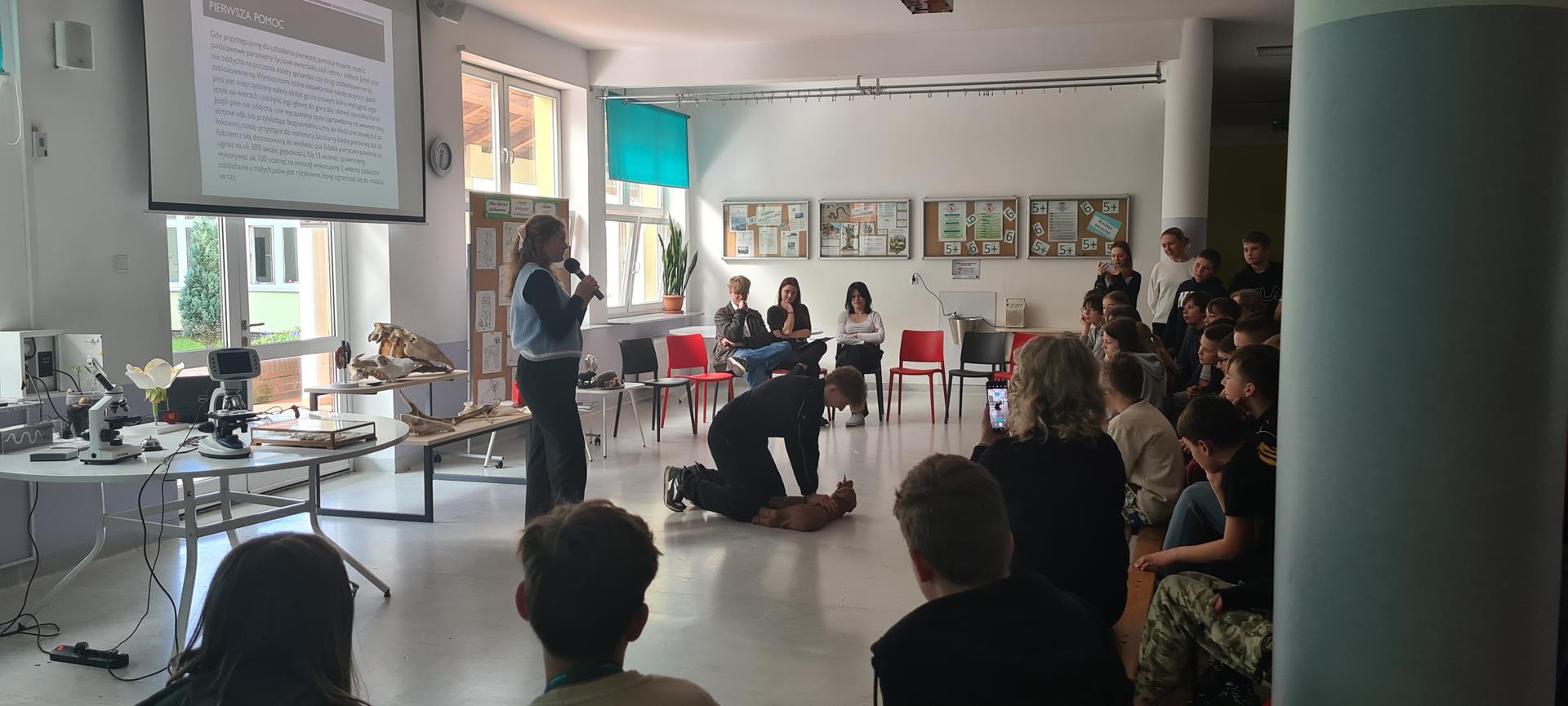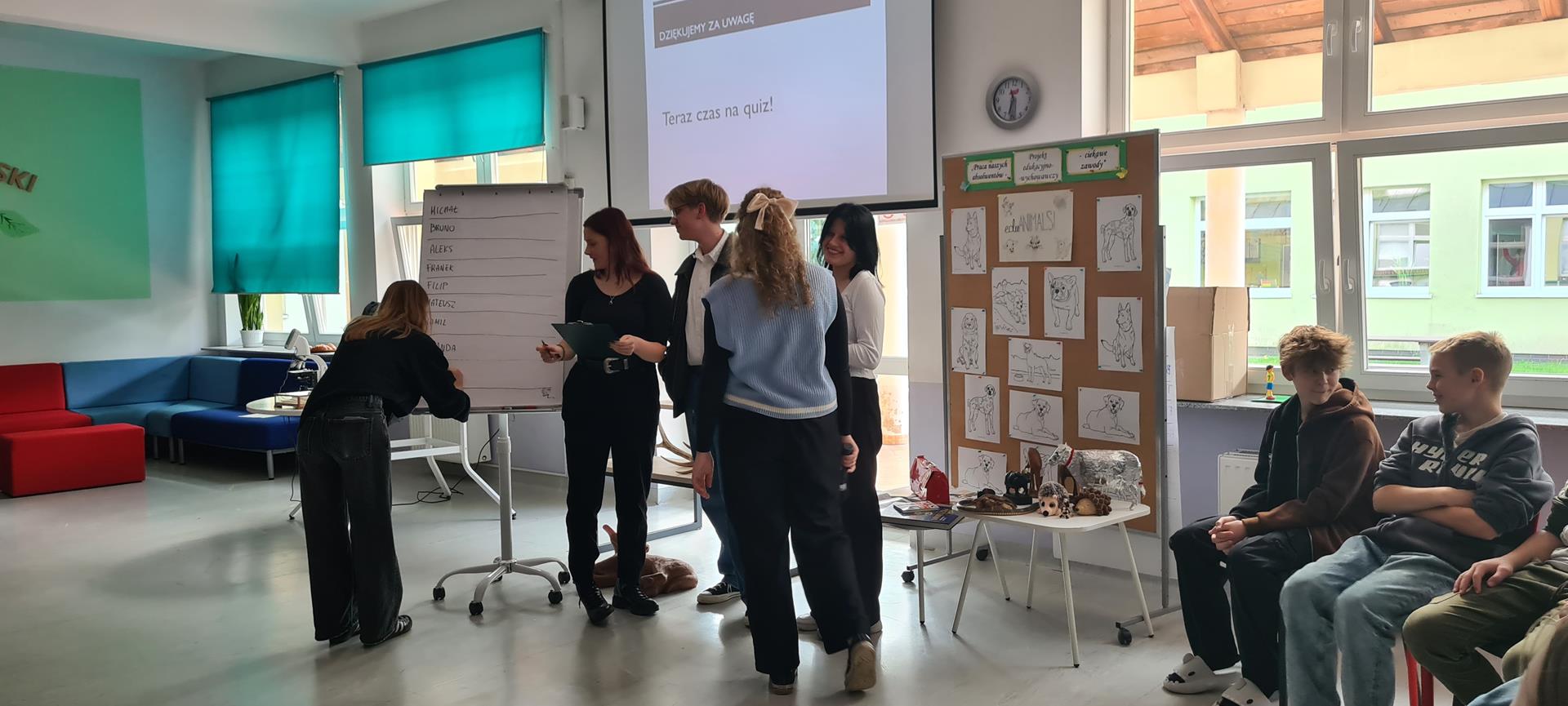 na fantomie psa jak należy prowadzić reanimację zwierzęcia. Dodatkowo zostało zaprezentowanych sporo rekwizytów jak kości czaszki konia, krowy, róg jelenia, zęby różnych zwierząt. Uczniowie mogli także zobaczyć przez mikroskop wiele ciekawych próbek tkanek, pasożytów. Na koniec został przeprowadzony quiz z nagrodami. Lekcja bardzo podobała się uczniom. To był prawdziwy sukces Eduanimalsów.