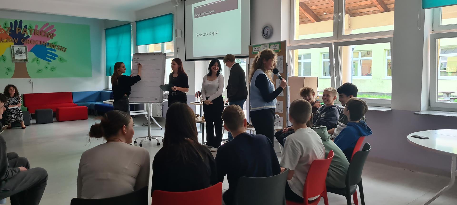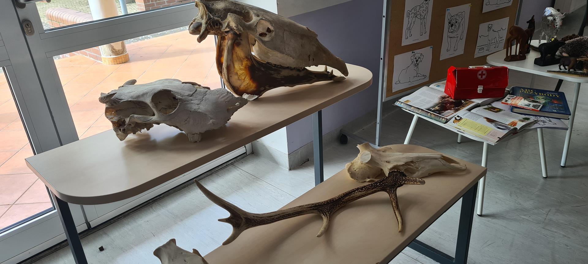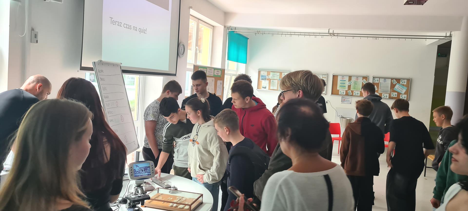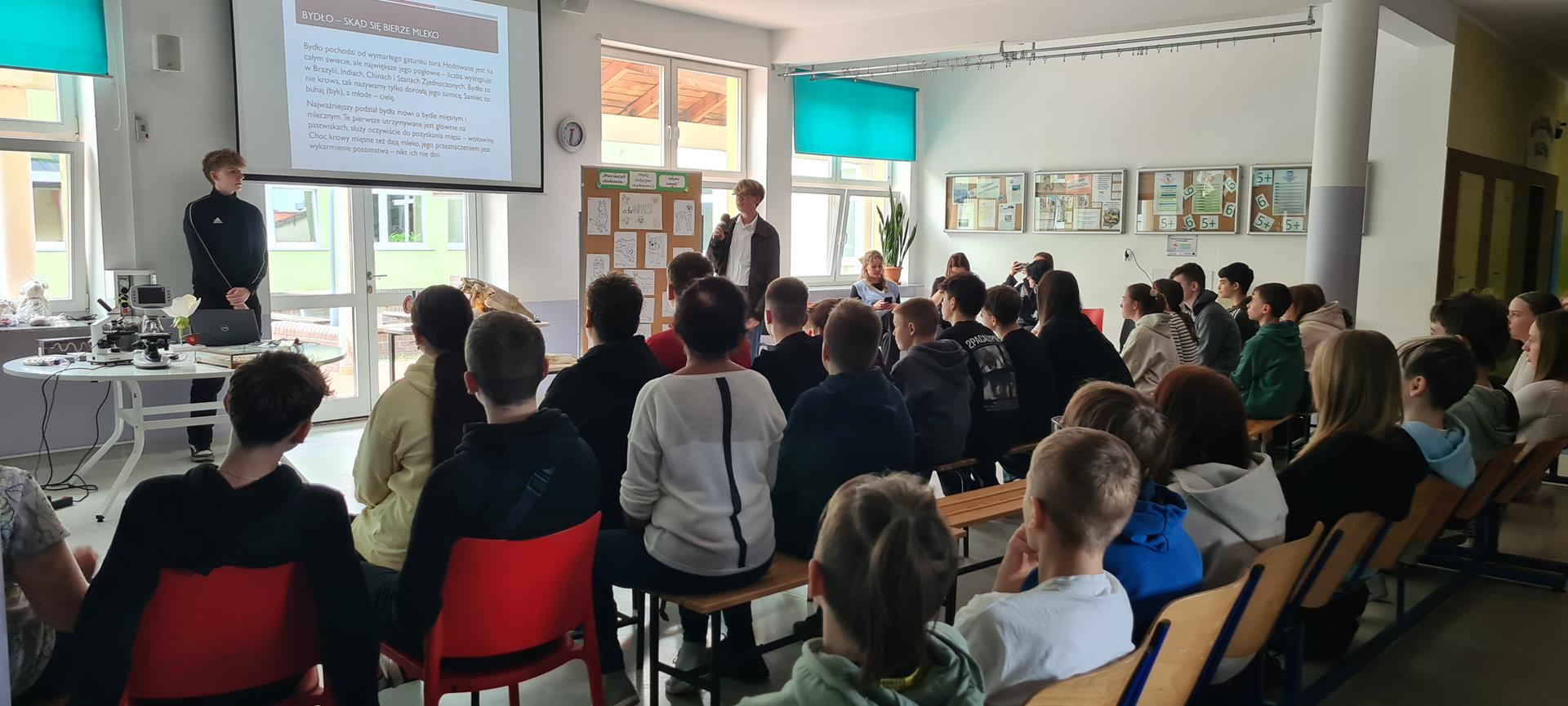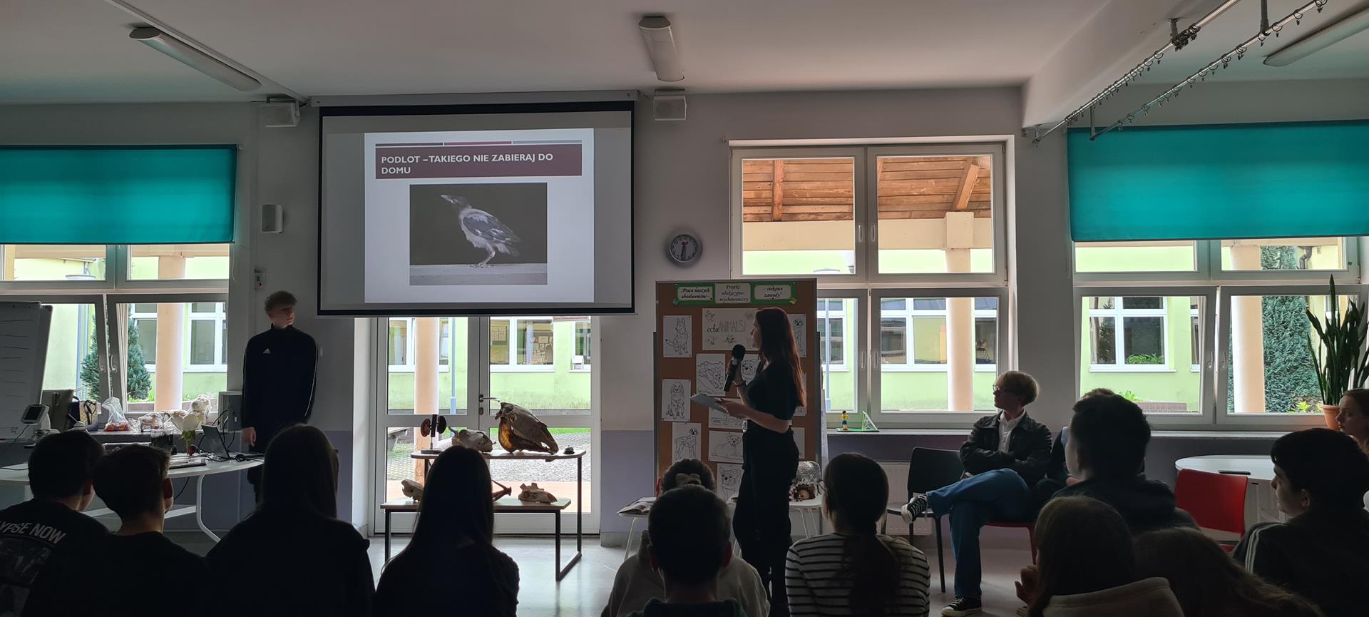na fantomie psa jak należy prowadzić reanimację zwierzęcia. Dodatkowo zostało zaprezentowanych sporo rekwizytów jak kości czaszki konia, krowy, róg jelenia, zęby różnych zwierząt. Uczniowie mogli także zobaczyć przez mikroskop wiele ciekawych próbek tkanek, pasożytów. Na koniec został przeprowadzony quiz z nagrodami. Lekcja bardzo podobała się uczniom. To był prawdziwy sukces Eduanimalsów.