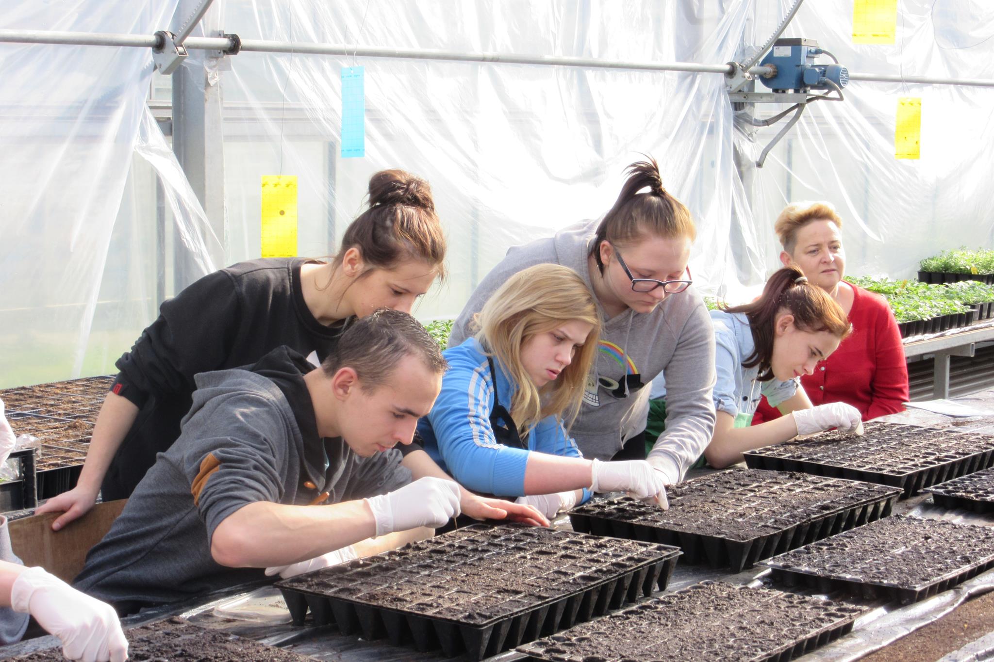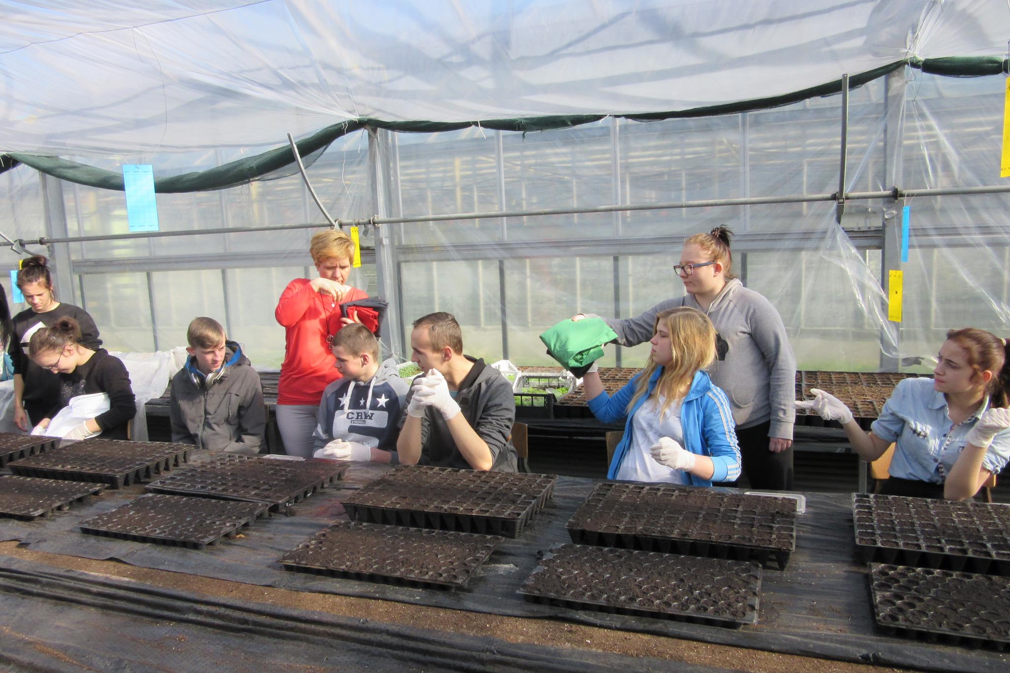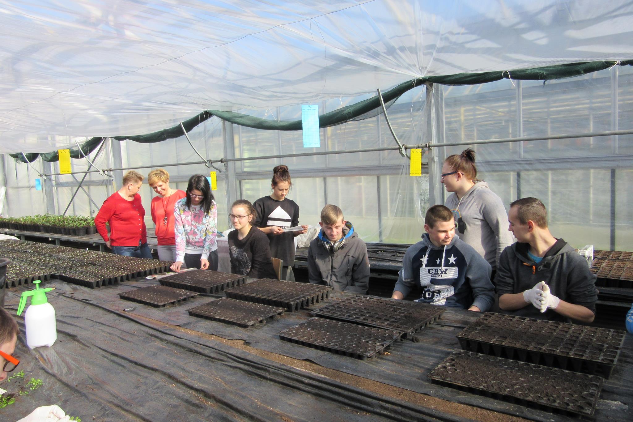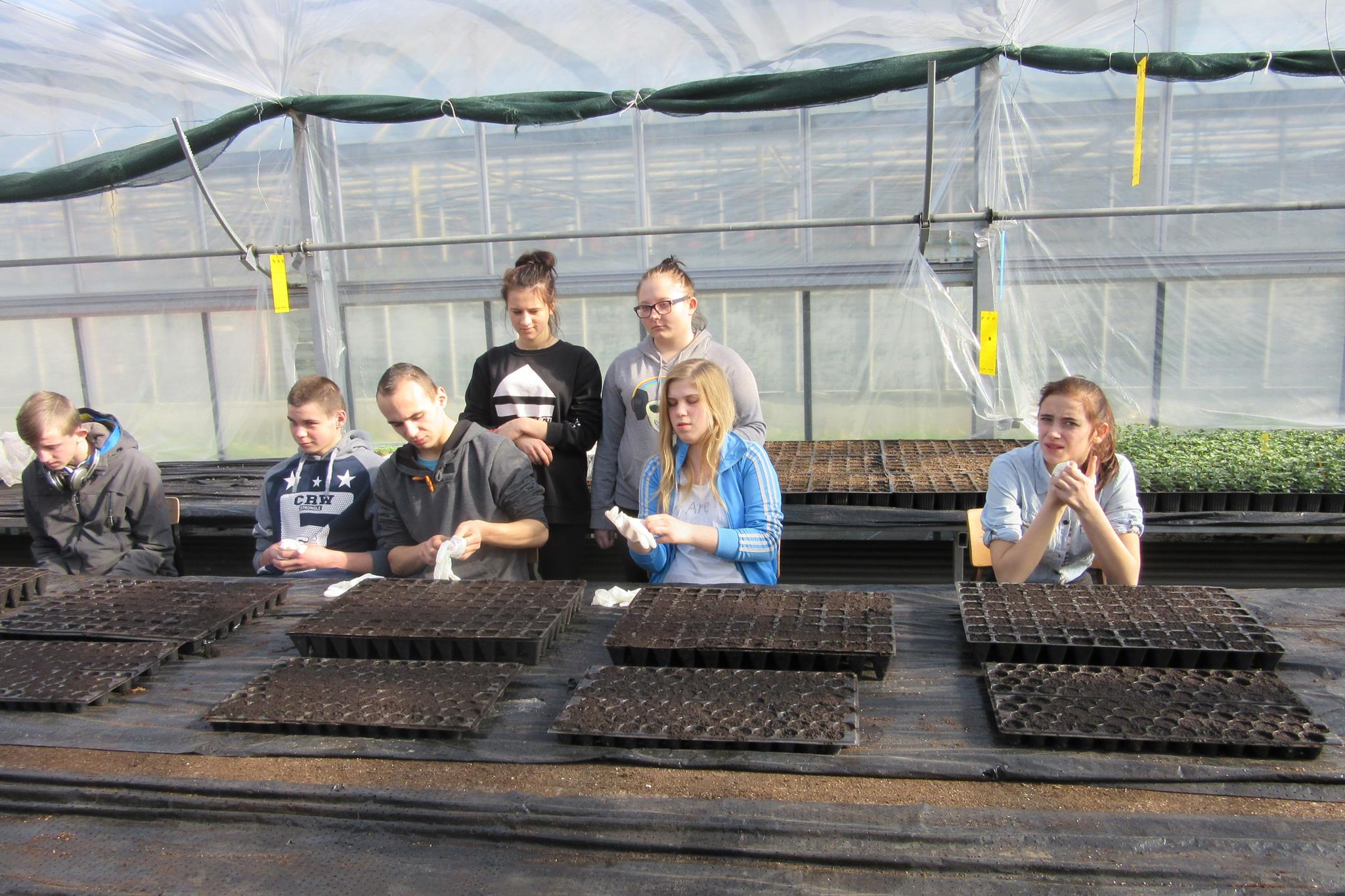 Przyszli kandydaci do naszej szkoły zwiedzali nasz teren, rozmawiali z uczniami i nauczycielami oraz uczestniczyli w warsztatach, wprowadzających w tajniki ogrodnictwa. Młodzież miała do wykonania siew punktowy kalarepy do tac wielokomorowych oraz pikowanie selera korzeniowego. Dla niektórych był to pierwszy kontakt z tak małymi roślinami. Chłopcy natomiast byli zainteresowani maszynami, które w tym czasie obsługiwali nasi uczniowie. Nad sprawnym wykonaniem zadania czuwały uczennice klasy II ZSZ – przyszłe ogrodniczki J. Była to okazja do wymiany doświadczeń, poznania się i wspólnej nauki poprzez zabawę.