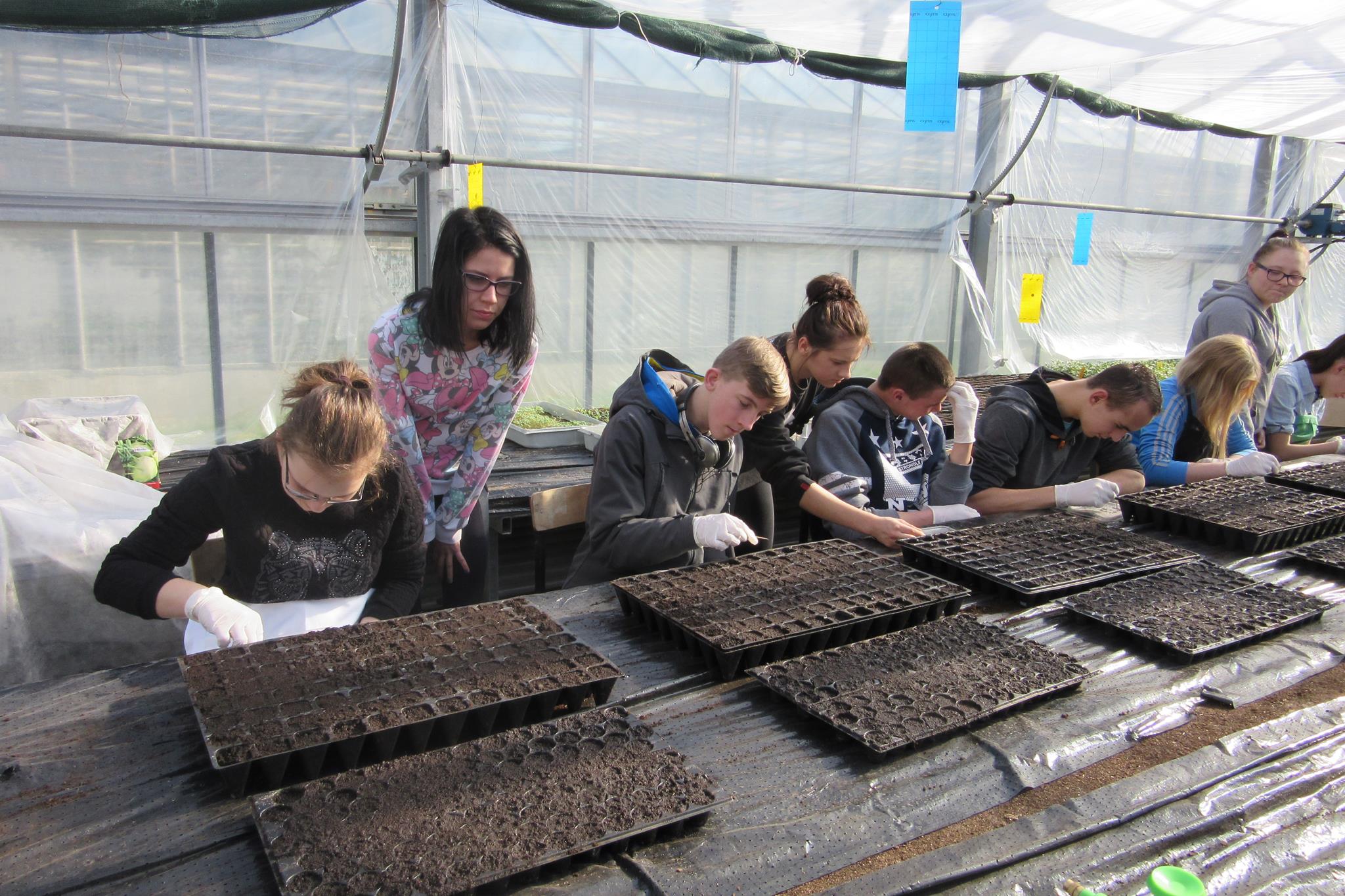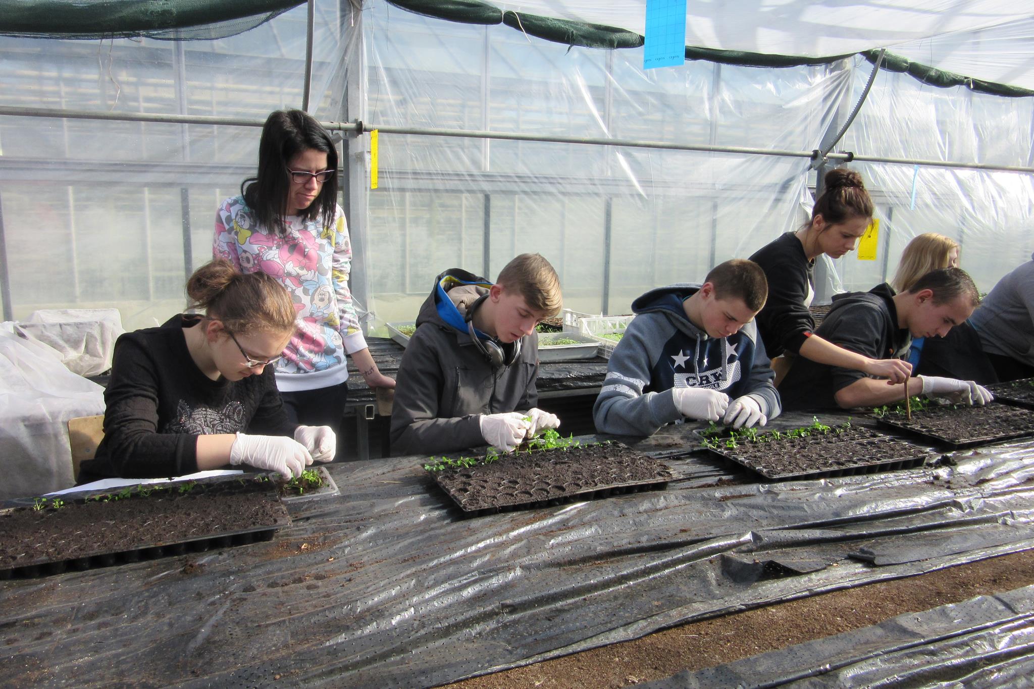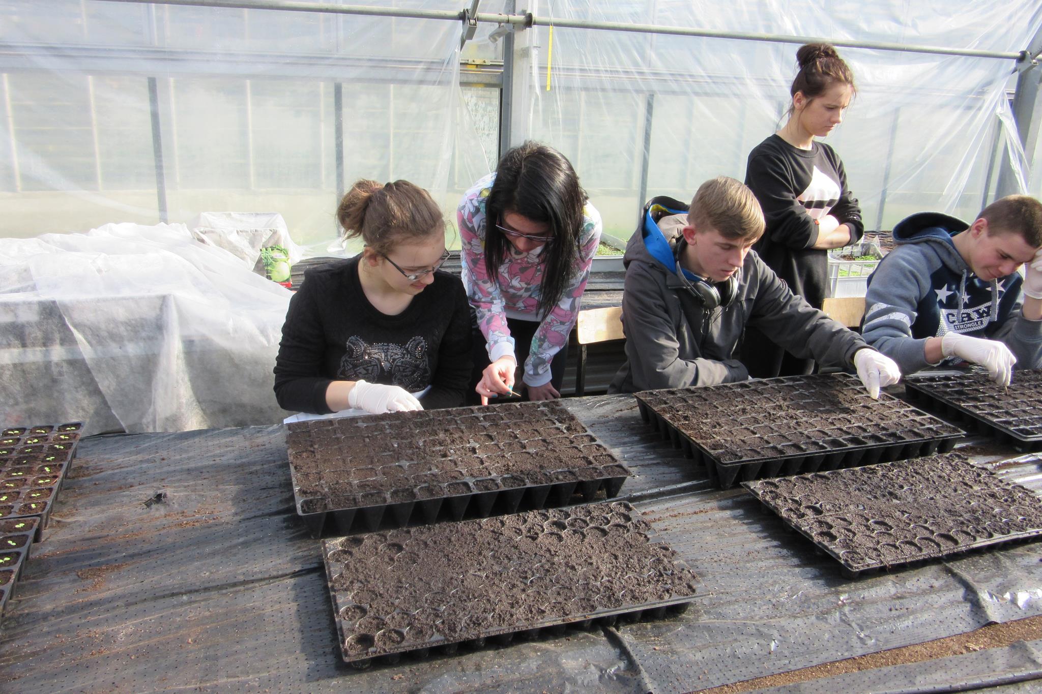 Przyszli kandydaci do naszej szkoły zwiedzali nasz teren, rozmawiali z uczniami i nauczycielami oraz uczestniczyli w warsztatach, wprowadzających w tajniki ogrodnictwa. Młodzież miała do wykonania siew punktowy kalarepy do tac wielokomorowych oraz pikowanie selera korzeniowego. Dla niektórych był to pierwszy kontakt z tak małymi roślinami. Chłopcy natomiast byli zainteresowani maszynami, które w tym czasie obsługiwali nasi uczniowie. Nad sprawnym wykonaniem zadania czuwały uczennice klasy II ZSZ – przyszłe ogrodniczki J. Była to okazja do wymiany doświadczeń, poznania się i wspólnej nauki poprzez zabawę.