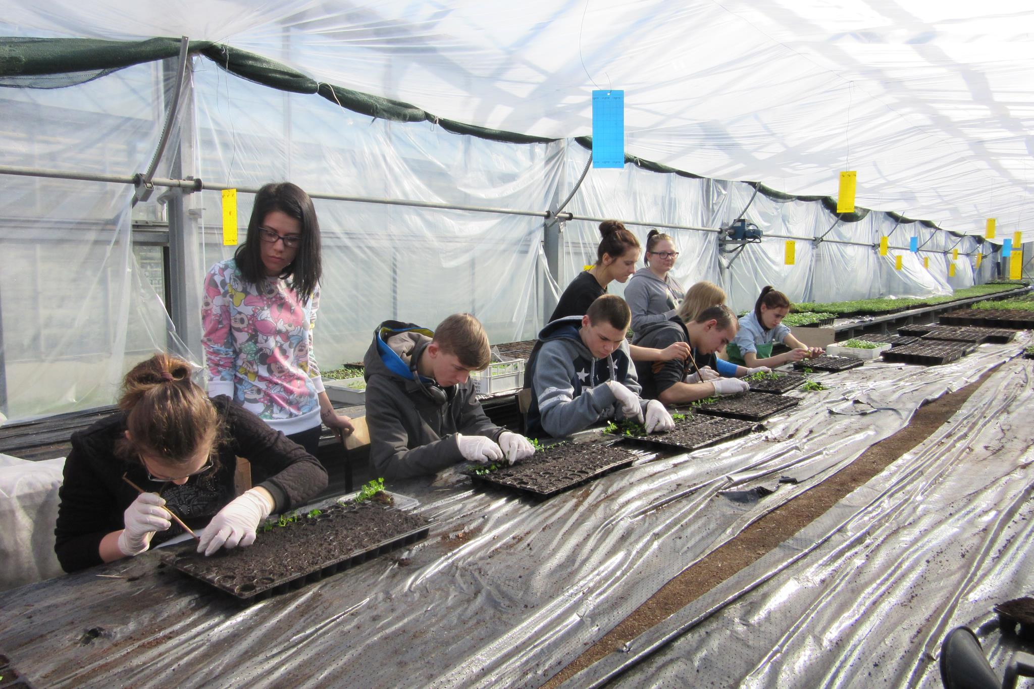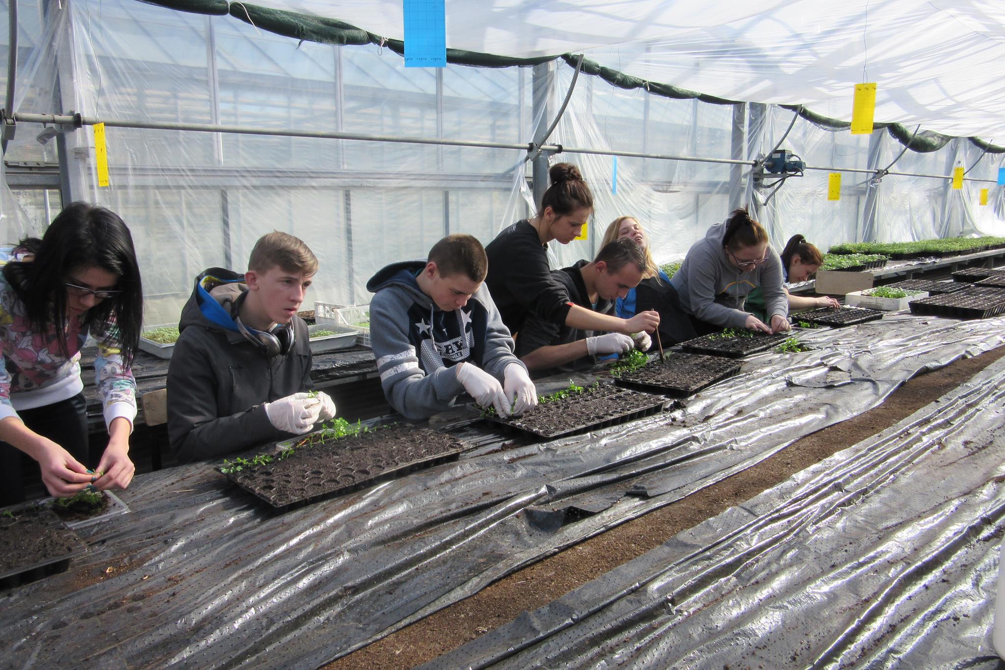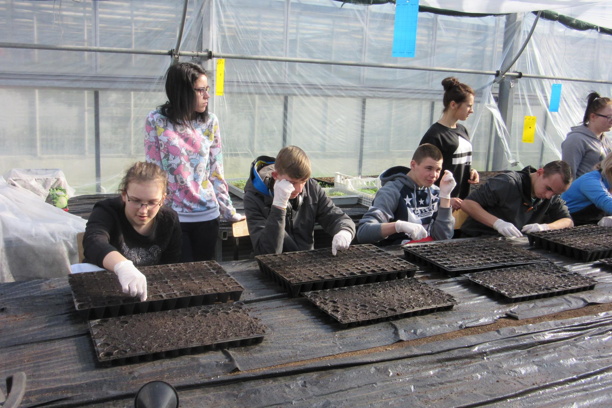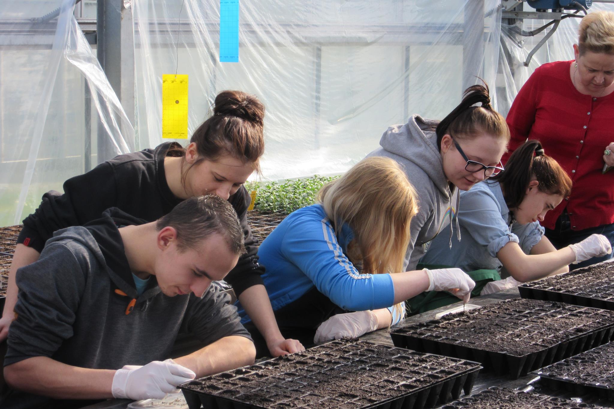 Przyszli kandydaci do naszej szkoły zwiedzali nasz teren, rozmawiali z uczniami i nauczycielami oraz uczestniczyli w warsztatach, wprowadzających w tajniki ogrodnictwa. Młodzież miała do wykonania siew punktowy kalarepy do tac wielokomorowych oraz pikowanie selera korzeniowego. Dla niektórych był to pierwszy kontakt z tak małymi roślinami. Chłopcy natomiast byli zainteresowani maszynami, które w tym czasie obsługiwali nasi uczniowie. Nad sprawnym wykonaniem zadania czuwały uczennice klasy II ZSZ – przyszłe ogrodniczki J. Była to okazja do wymiany doświadczeń, poznania się i wspólnej nauki poprzez zabawę.