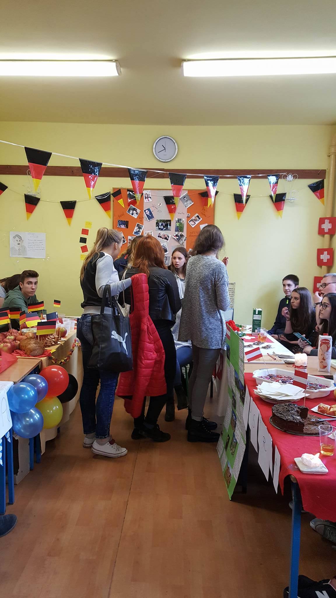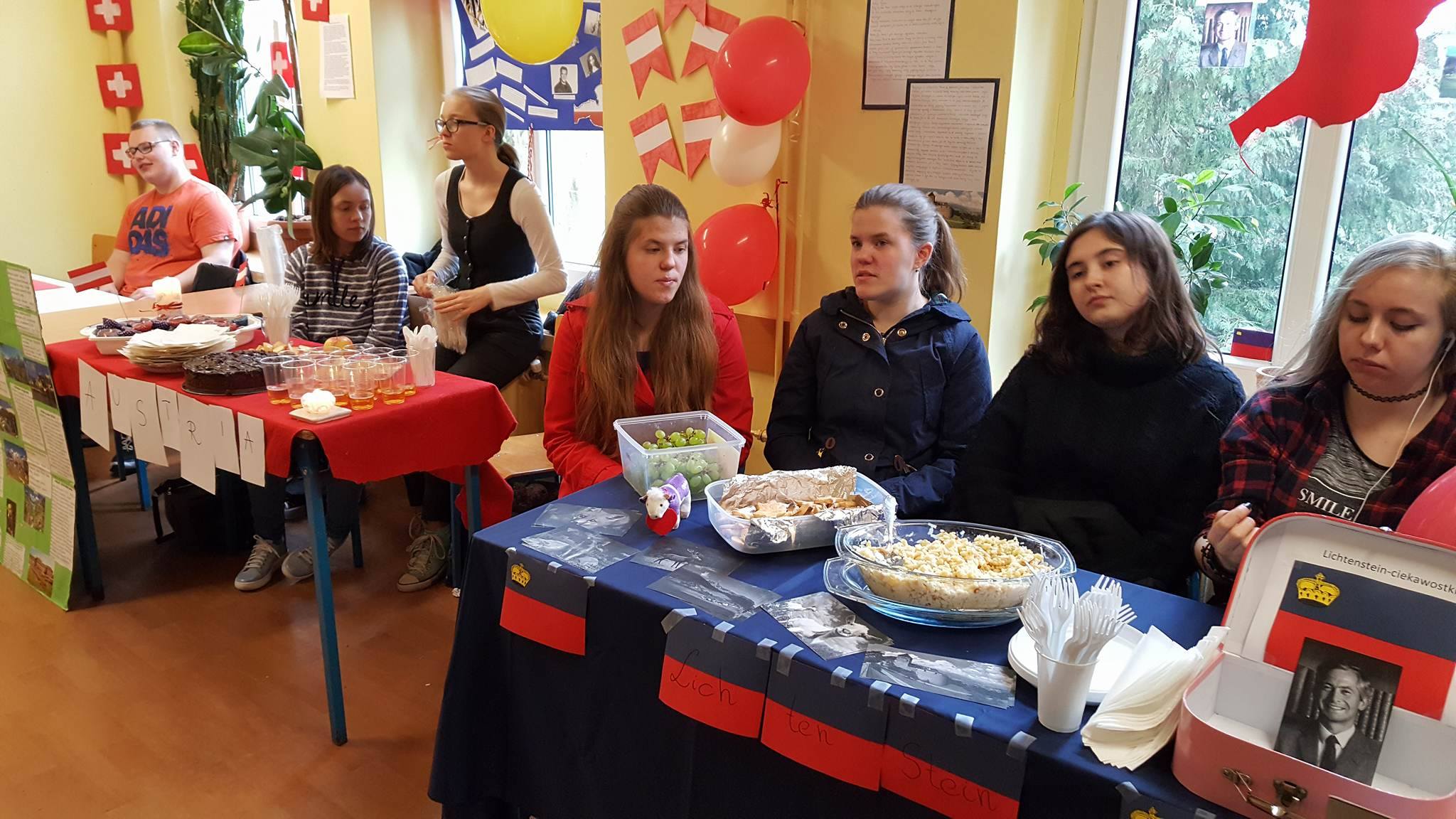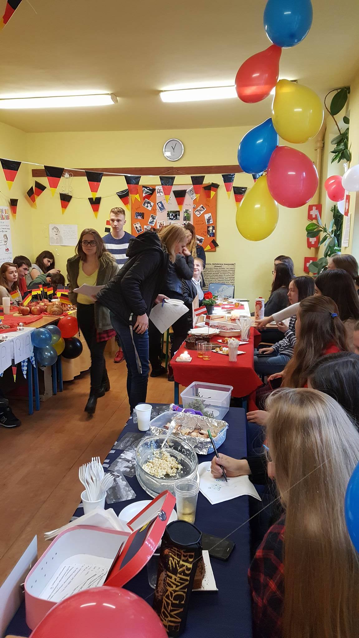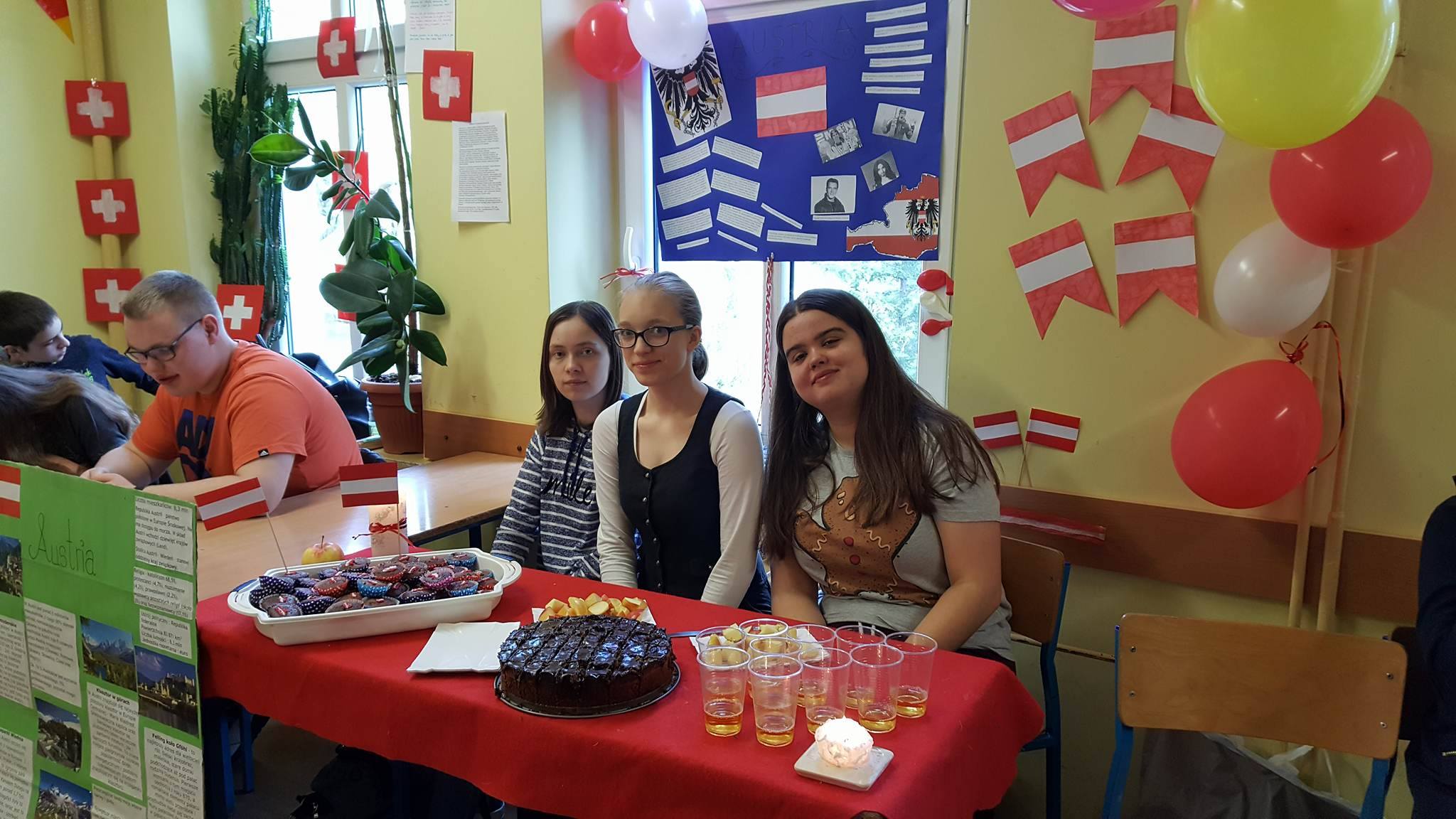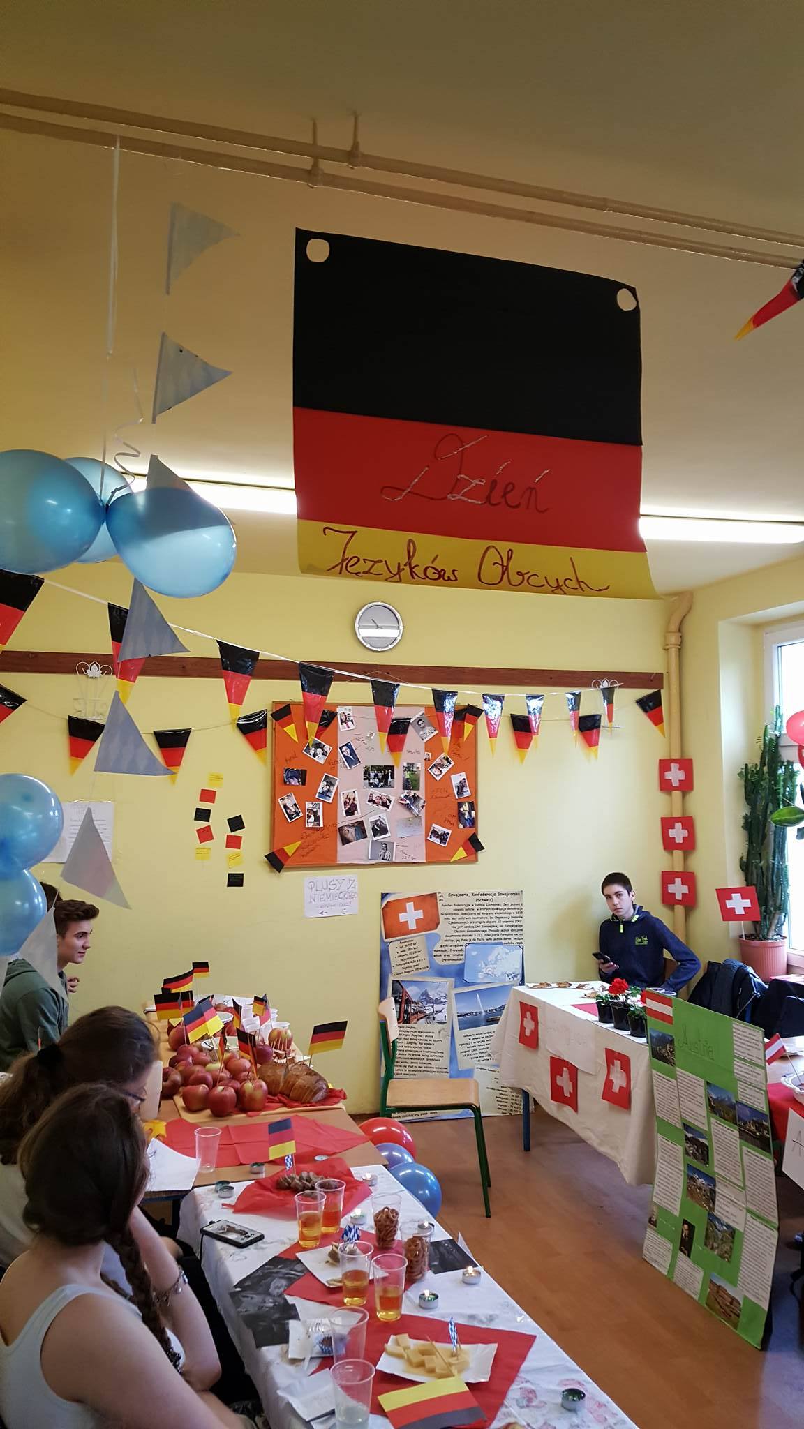 Głównym punktem i zarazem efektem przygotowań czteroosobowych grup uczniów klas pierwszych, było zaprezentowanie wystaw przedstawiających kraje niemiecko – i anglojęzyczne oraz zaproszenie kolegów i koleżanek z innych klas wraz z opiekunami na degustację potraw. Uczniowie z wielkim zaangażowaniem pracowali nad przygotowaniem swoich „wysp językowych”, własnoręcznie wykonali dekoracje, dobrali i przygotowali podkład muzyczny, a także sporządzili różne potrawy według oryginalnych przepisów niemieckich i angielskich. Zaprezentowane zostały: Anglia, Irlandia, Walia, Stany Zjednoczone, Kanada, Australia, Niemcy, Monachium, Bawaria, Księstwo Lichtensteinu, Austria oraz Szwajcaria. Każdy uczeń oraz nauczyciel po obejrzeniu wszystkich stanowisk miał prawo oddania jednego głosu na wybrany kraj. Zwycięska drużyna zostanie nagrodzona na najbliższym apelu słodką niespodzianką.