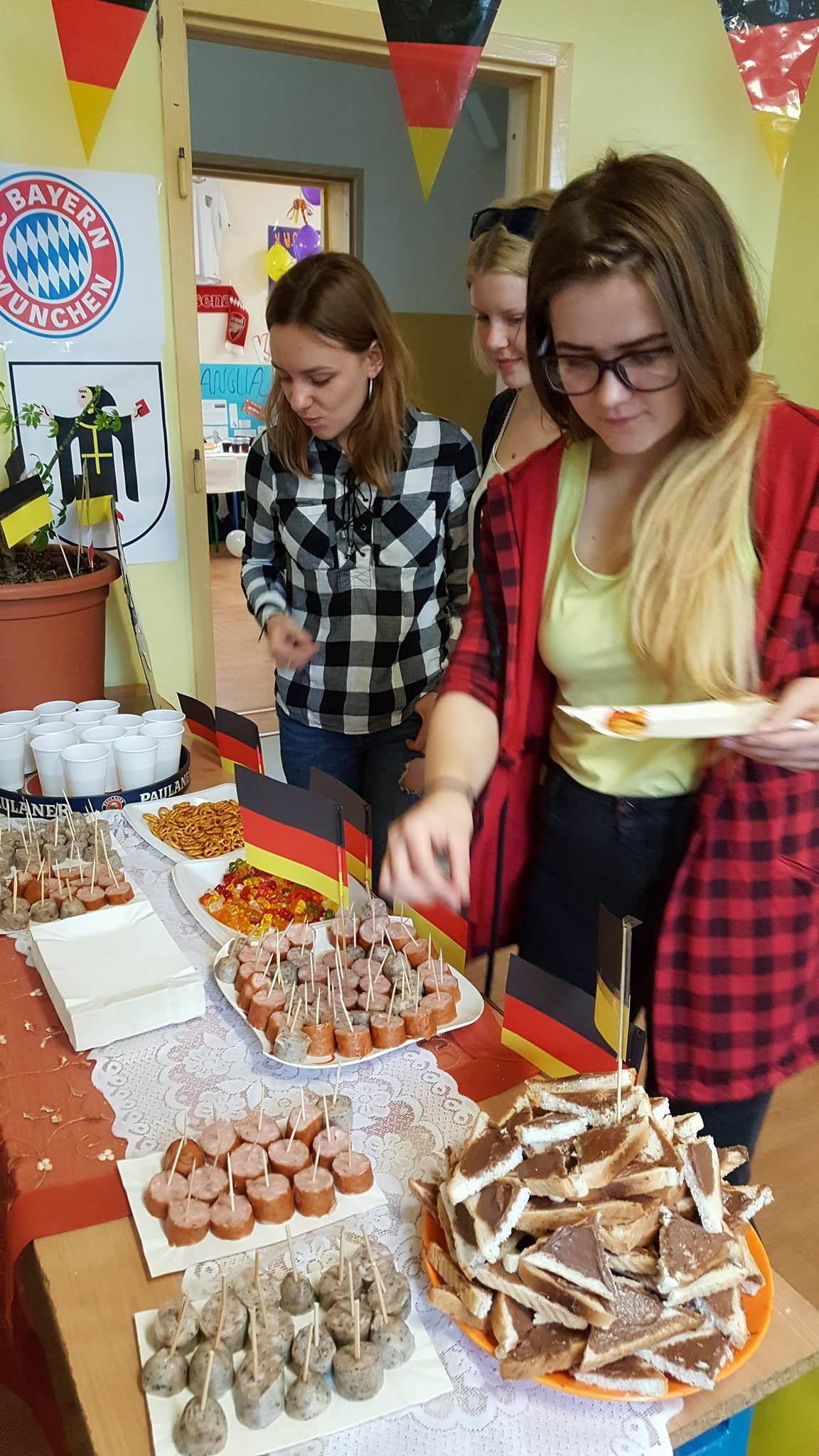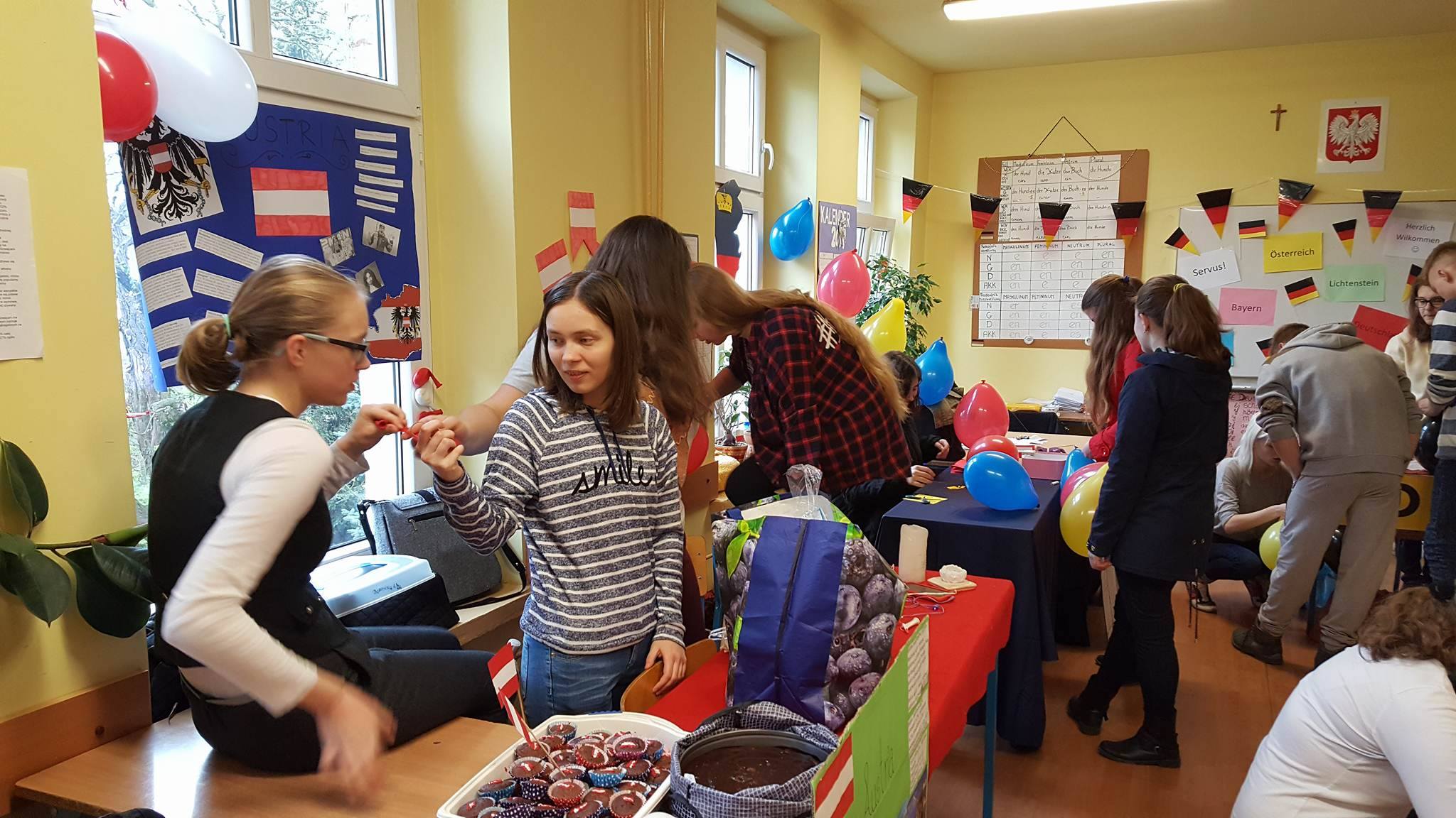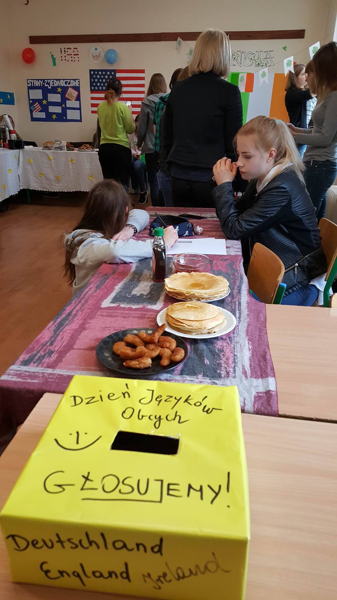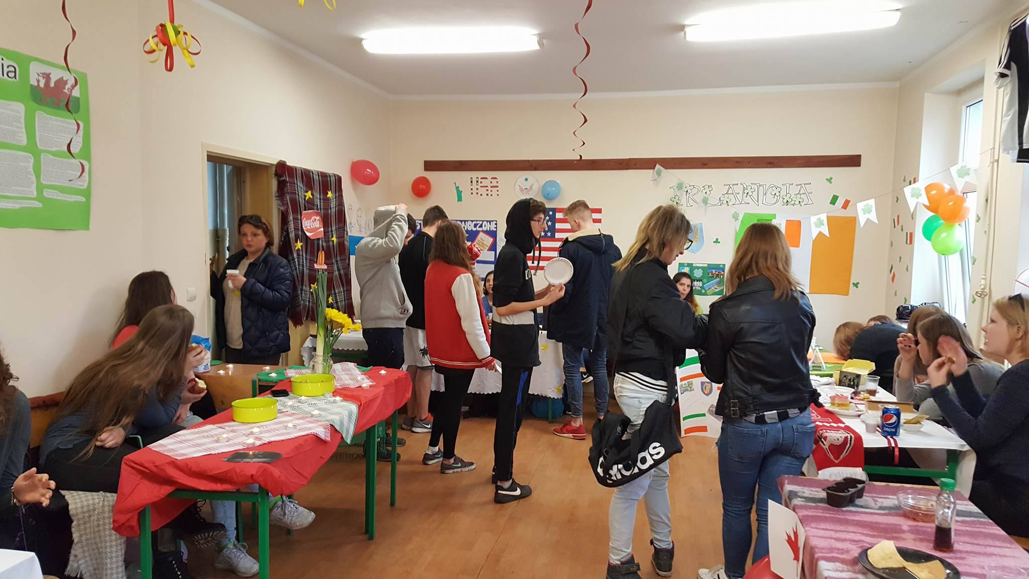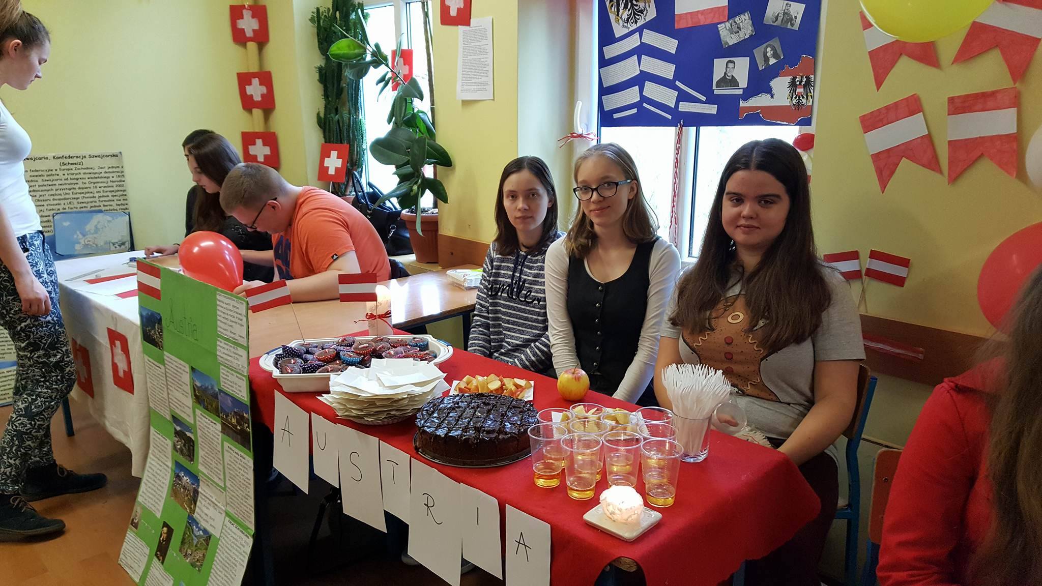 Głównym punktem i zarazem efektem przygotowań czteroosobowych grup uczniów klas pierwszych, było zaprezentowanie wystaw przedstawiających kraje niemiecko – i anglojęzyczne oraz zaproszenie kolegów i koleżanek z innych klas wraz z opiekunami na degustację potraw. Uczniowie z wielkim zaangażowaniem pracowali nad przygotowaniem swoich „wysp językowych”, własnoręcznie wykonali dekoracje, dobrali i przygotowali podkład muzyczny, a także sporządzili różne potrawy według oryginalnych przepisów niemieckich i angielskich. Zaprezentowane zostały: Anglia, Irlandia, Walia, Stany Zjednoczone, Kanada, Australia, Niemcy, Monachium, Bawaria, Księstwo Lichtensteinu, Austria oraz Szwajcaria. Każdy uczeń oraz nauczyciel po obejrzeniu wszystkich stanowisk miał prawo oddania jednego głosu na wybrany kraj. Zwycięska drużyna zostanie nagrodzona na najbliższym apelu słodką niespodzianką.