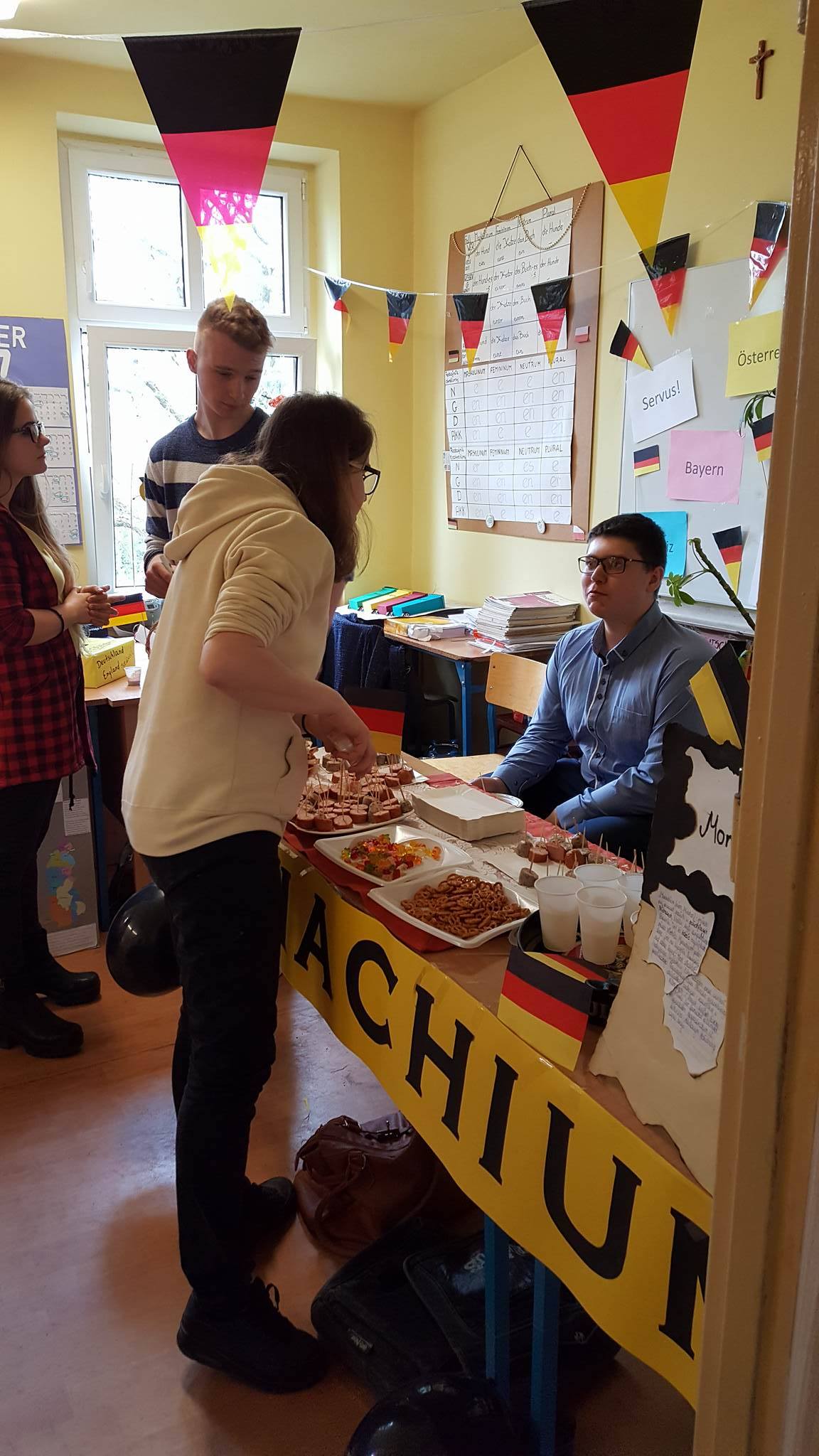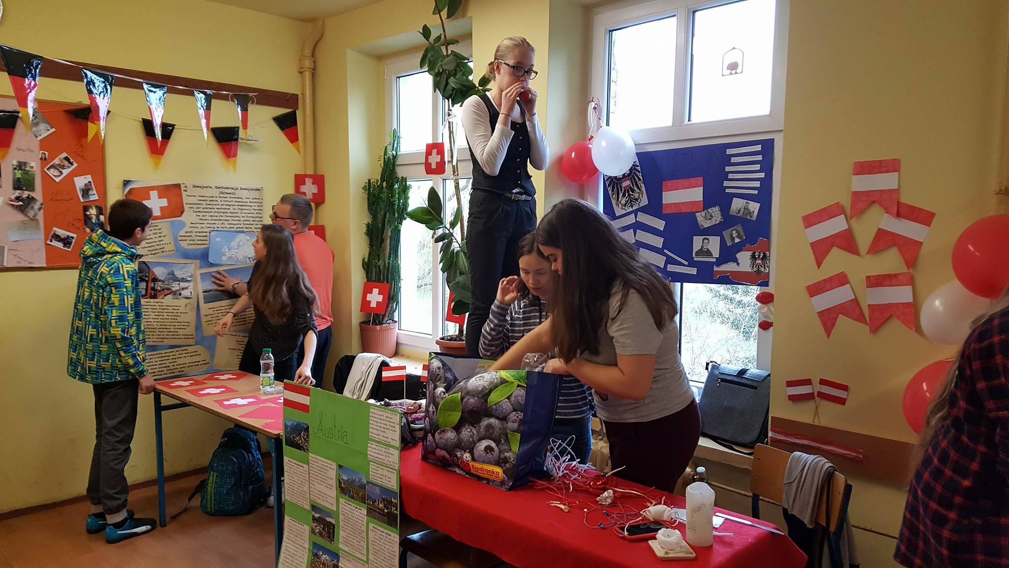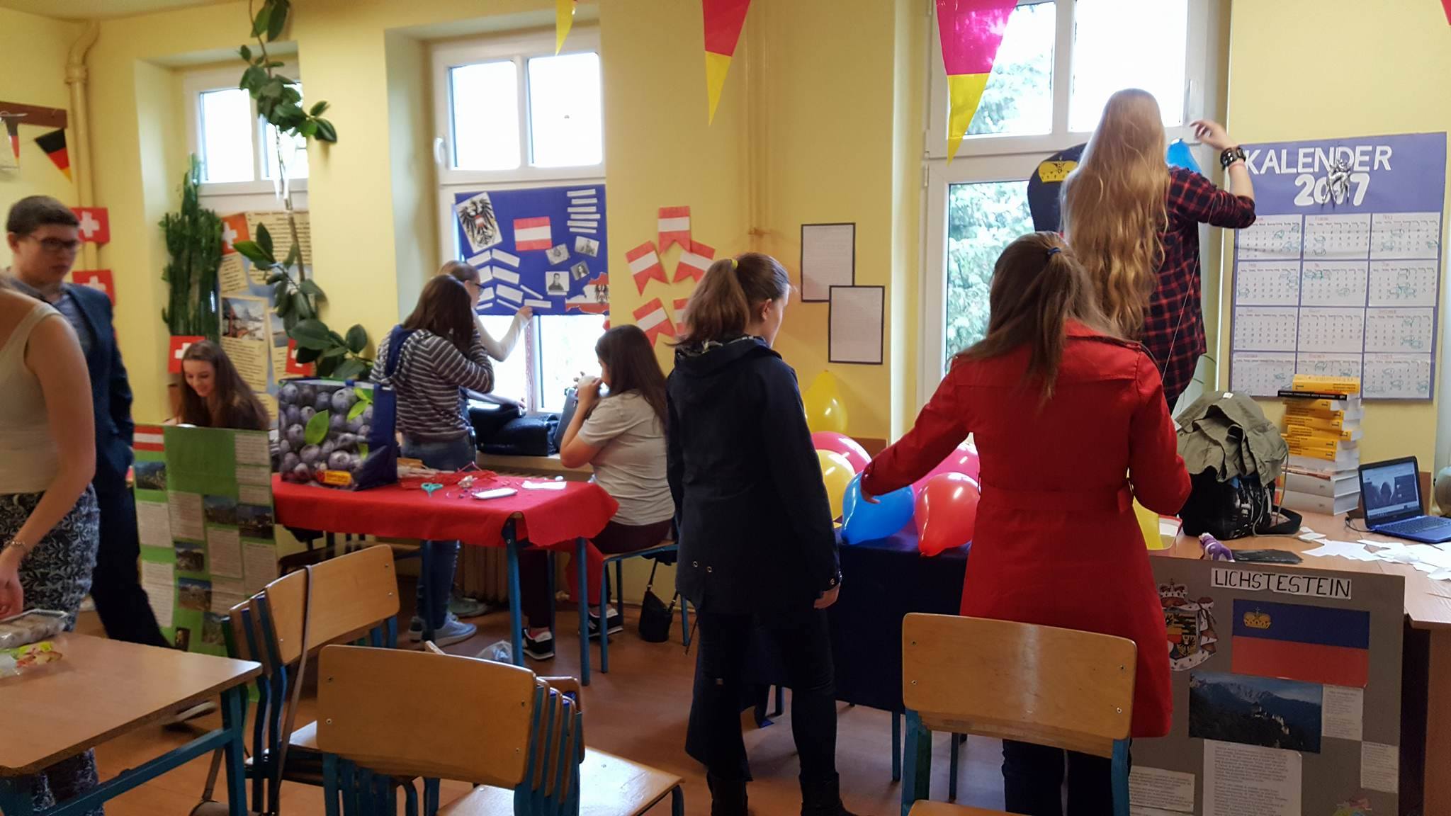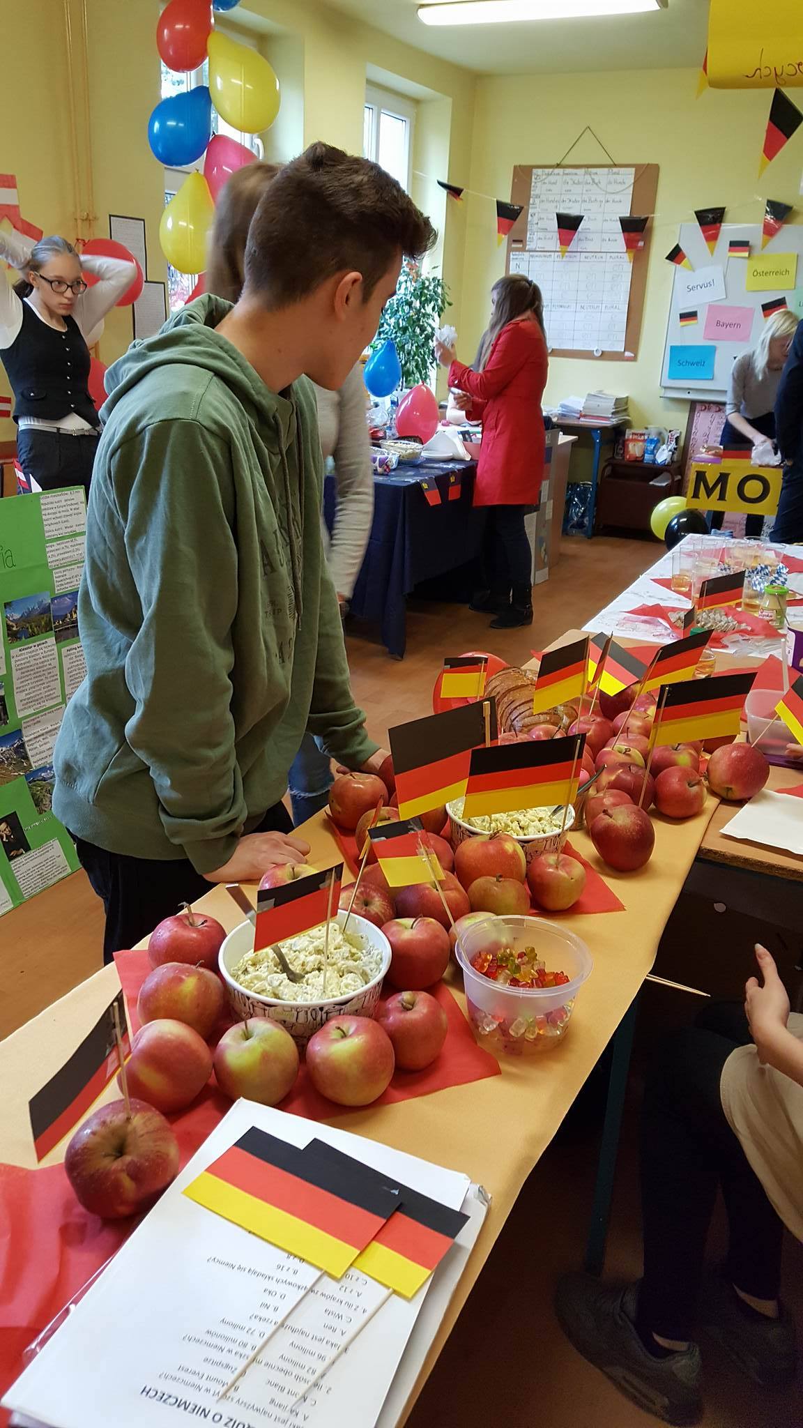 Głównym punktem i zarazem efektem przygotowań czteroosobowych grup uczniów klas pierwszych, było zaprezentowanie wystaw przedstawiających kraje niemiecko – i anglojęzyczne oraz zaproszenie kolegów i koleżanek z innych klas wraz z opiekunami na degustację potraw. Uczniowie z wielkim zaangażowaniem pracowali nad przygotowaniem swoich „wysp językowych”, własnoręcznie wykonali dekoracje, dobrali i przygotowali podkład muzyczny, a także sporządzili różne potrawy według oryginalnych przepisów niemieckich i angielskich. Zaprezentowane zostały: Anglia, Irlandia, Walia, Stany Zjednoczone, Kanada, Australia, Niemcy, Monachium, Bawaria, Księstwo Lichtensteinu, Austria oraz Szwajcaria. Każdy uczeń oraz nauczyciel po obejrzeniu wszystkich stanowisk miał prawo oddania jednego głosu na wybrany kraj. Zwycięska drużyna zostanie nagrodzona na najbliższym apelu słodką niespodzianką.