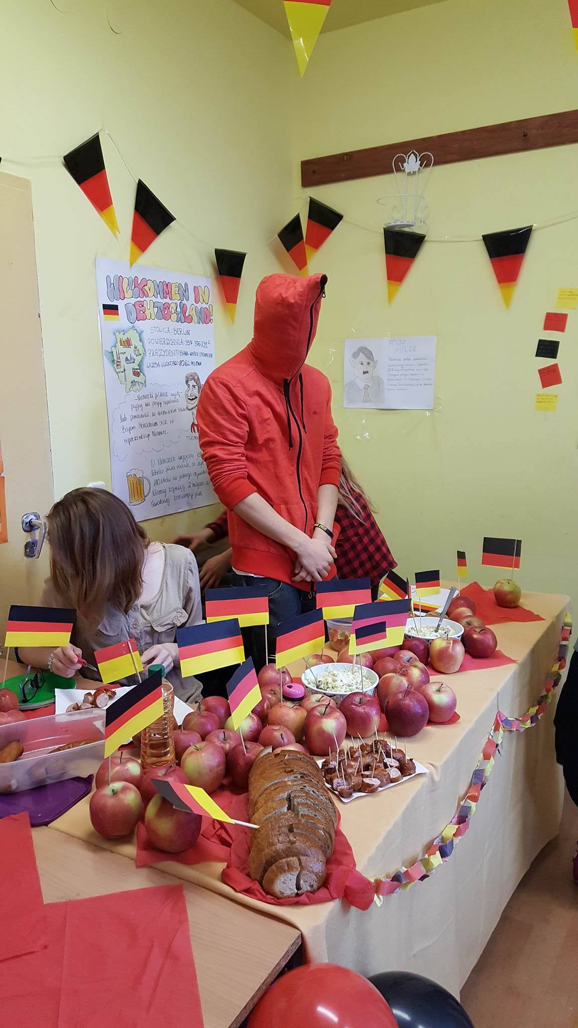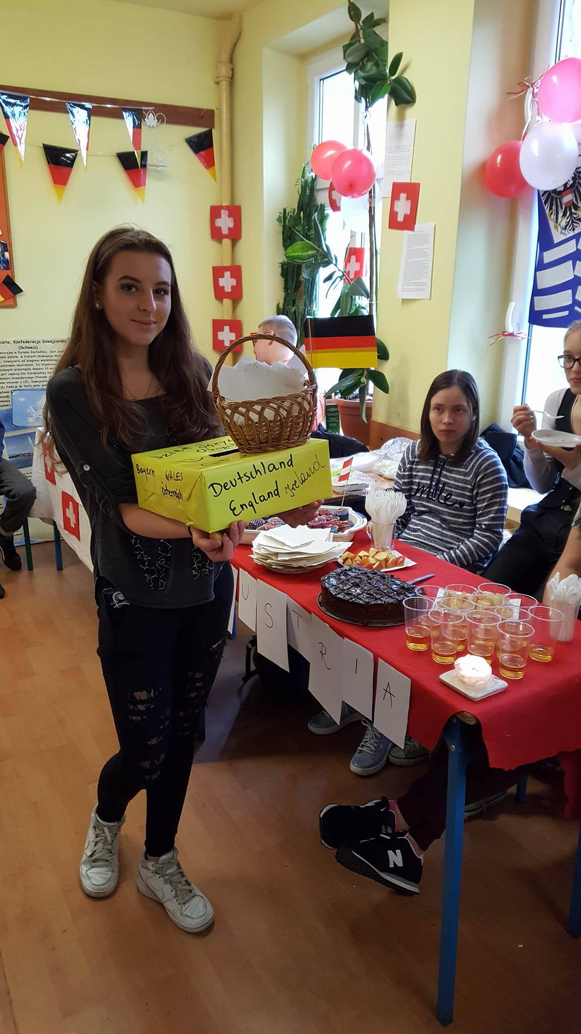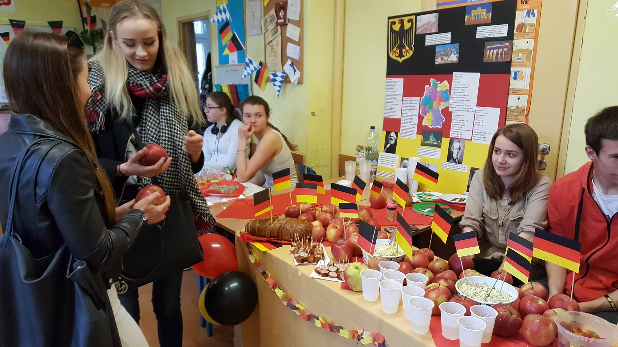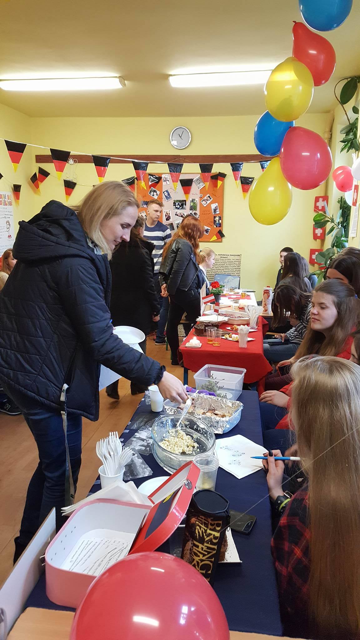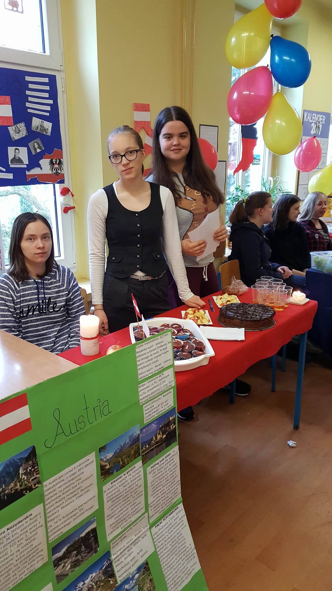 Głównym punktem i zarazem efektem przygotowań czteroosobowych grup uczniów klas pierwszych, było zaprezentowanie wystaw przedstawiających kraje niemiecko – i anglojęzyczne oraz zaproszenie kolegów i koleżanek z innych klas wraz z opiekunami na degustację potraw. Uczniowie z wielkim zaangażowaniem pracowali nad przygotowaniem swoich „wysp językowych”, własnoręcznie wykonali dekoracje, dobrali i przygotowali podkład muzyczny, a także sporządzili różne potrawy według oryginalnych przepisów niemieckich i angielskich. Zaprezentowane zostały: Anglia, Irlandia, Walia, Stany Zjednoczone, Kanada, Australia, Niemcy, Monachium, Bawaria, Księstwo Lichtensteinu, Austria oraz Szwajcaria. Każdy uczeń oraz nauczyciel po obejrzeniu wszystkich stanowisk miał prawo oddania jednego głosu na wybrany kraj. Zwycięska drużyna zostanie nagrodzona na najbliższym apelu słodką niespodzianką.