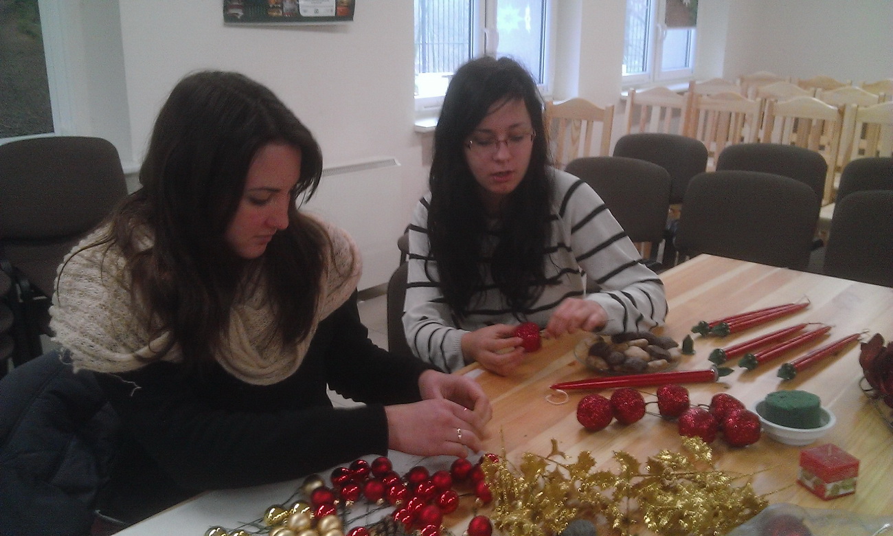 Przygotowywały bowiem dekoracje świąteczne w ramach sąsiedzkiej współpracy Centrum Edukacji Ogrodniczej oraz Szczecińskiego Centrum Informacji Turystycznej „Szmaragdowe Zdroje”. Były to stroiki bożonarodzeniowe na uroczystą wigilię organizowaną przez Szczecińskie Stowarzyszenie Poszukiwawcze. Ale by powstały piękne kompozycje, musiały wykonać szereg czynności przygotowawczych. Najpierw ścięte zostały gałązki świerka i jodły niezbędne do wykonania dekoracji. Następnie dziewczęta przygotowywały materiały i ozdoby. Mocowały druciki do bombek, gwiazdek i innych elementów. Klejem na ciepło przyklejały wykałaczki do szyszek. Gdy cały materiał był gotowy, przystąpiły do wykonania długich, bo ponad metrowych prac, których część centralną stanowiły cztery świece oraz mnóstwo złotych i czerwonych elementów.