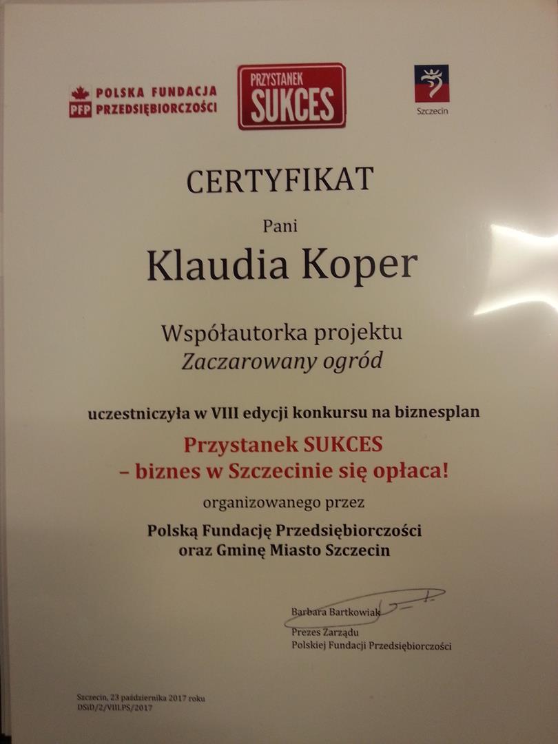 Grupa uczniów z klasy II TK, pod opieką p. Joanny Sylwestrzak, opracowała biznesplan pt. „ZACZAROWANY OGRÓD”. Ideą tego pomysłu było założenie miejsca przyjaznego osobom starszym z funkcjonalnym ogrodem hortiterapeutycznym z siedzibą w Szczecinie. Pomysł spodobał się Kapitule Konkursowej, w składzie której znaleźli się eksperci z Polskiej Fundacji Przedsiębiorczości, przedstawiciel Urzędu Miasta Szczecin oraz ekspert Banku Zachodniego WBK. Biznesplan naszych uczniów został wyróżniony w kategorii do lat 18, jako jeden z siedmiu finałowych, wśród 50 złożonych.