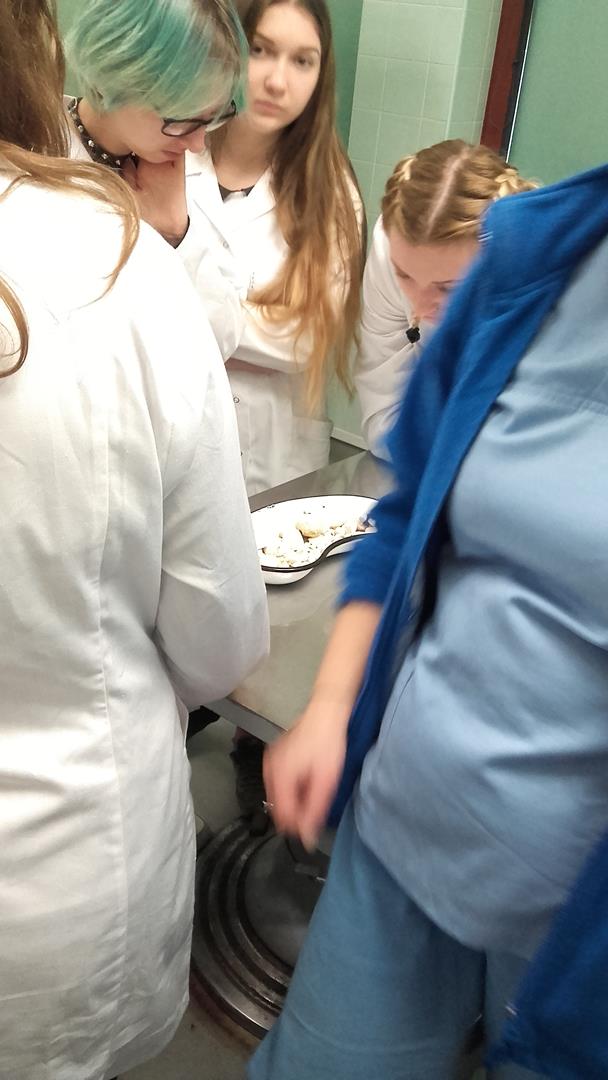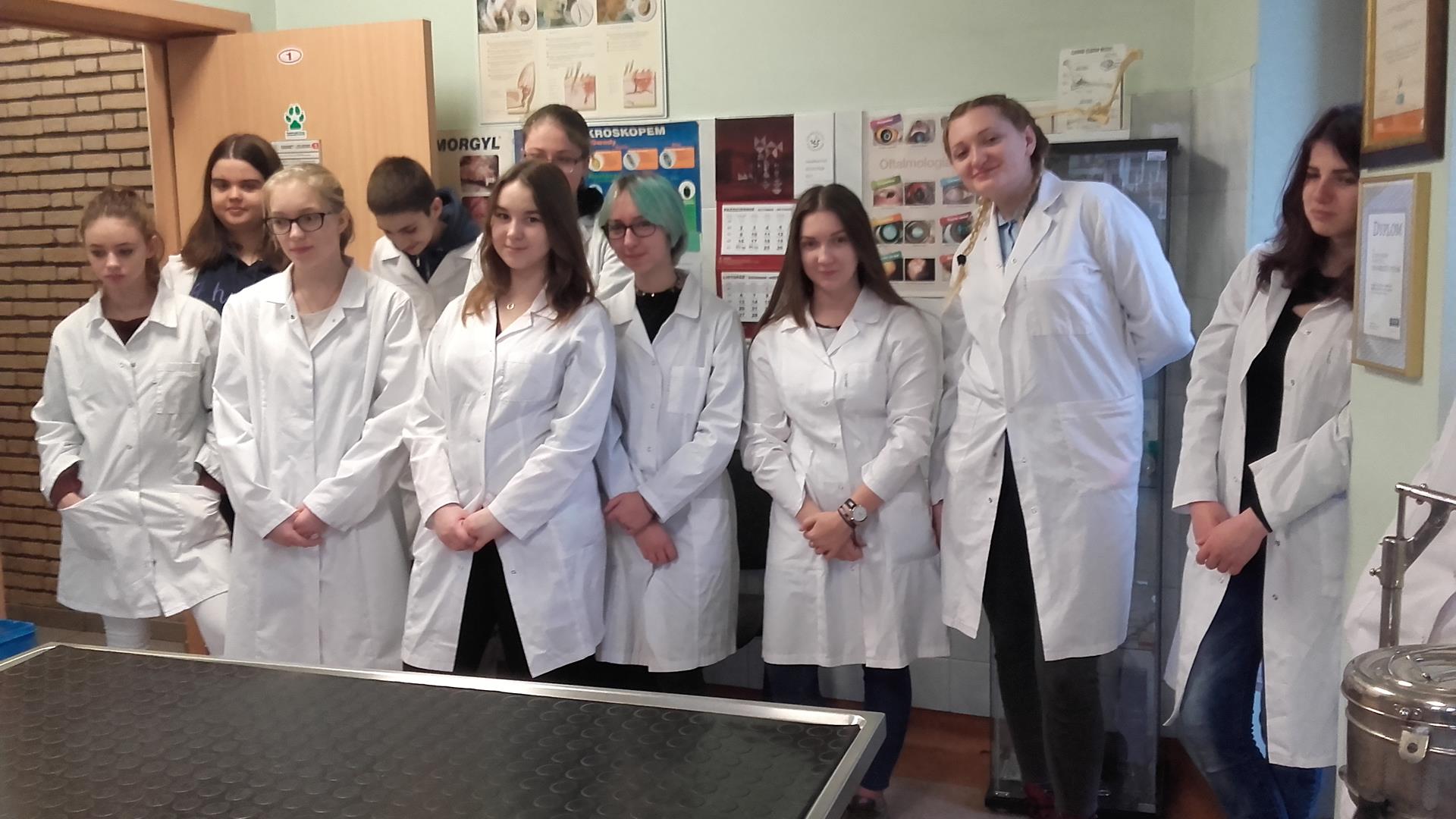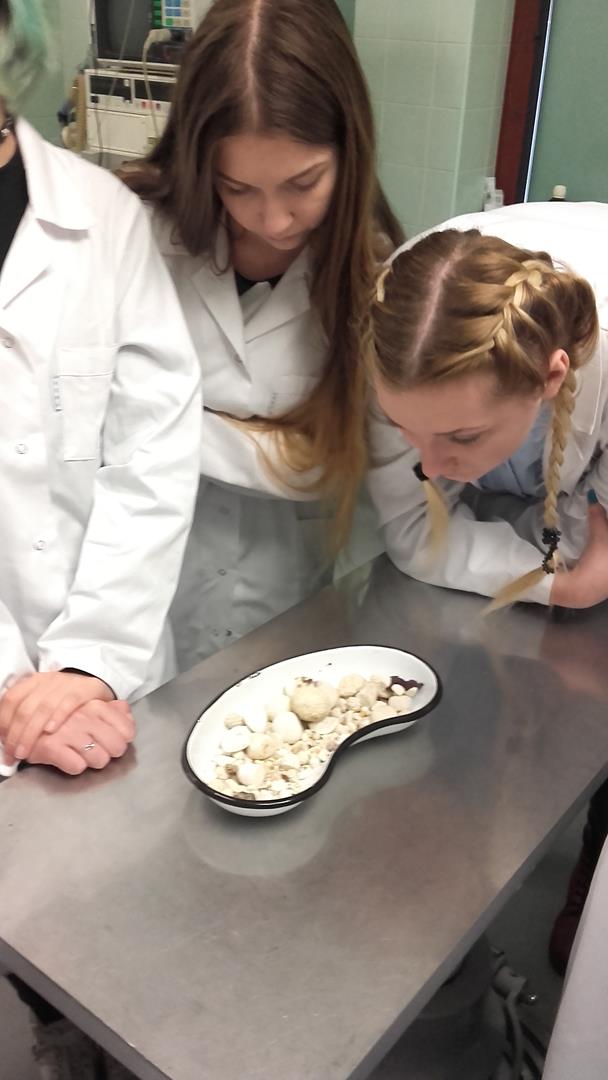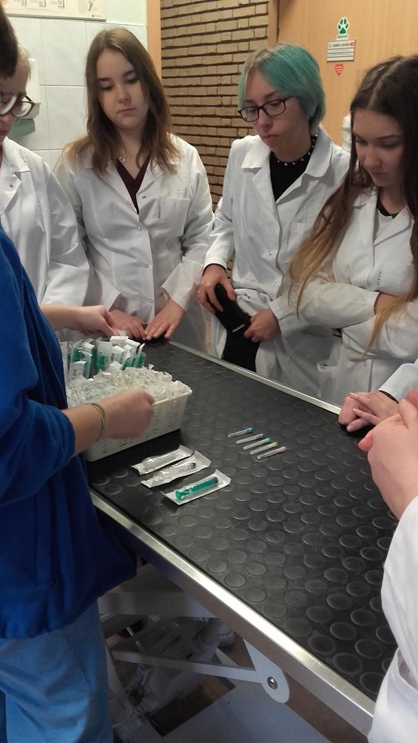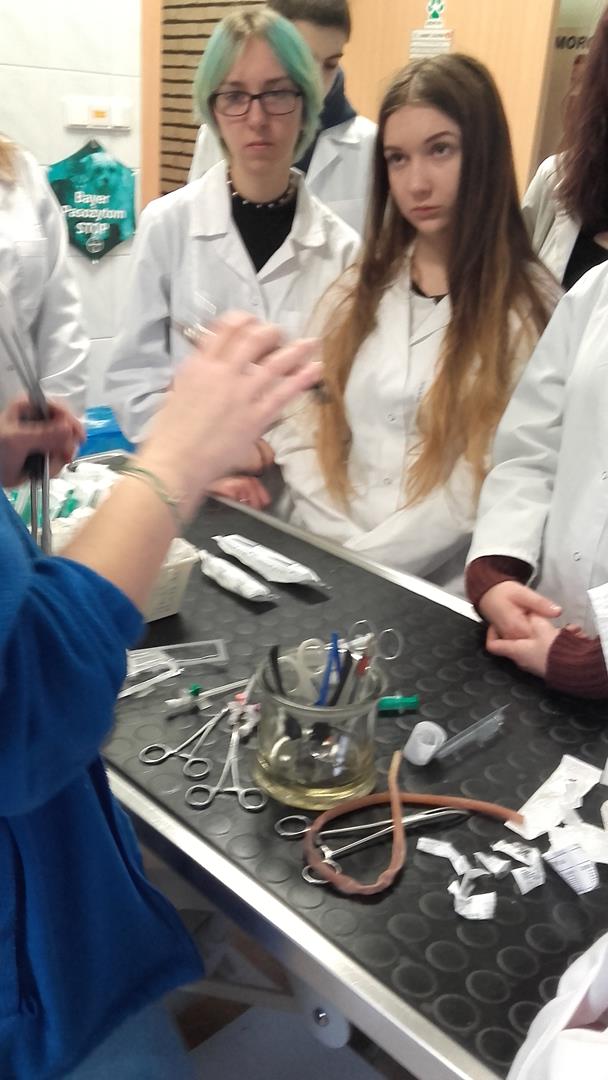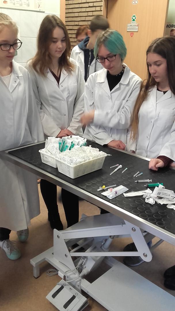 Na ostatnich zajęciach praktycznych w Klinice Zwierząt Domowych uczniowie klasy drugiej zapoznali się z podstawowymi narzędziami potrzebnymi do pobrania krwi. Porównywali igły dostępne w gabinecie weterynaryjnym, strzykawki, różne typy wenflonów, a także poznawali zasady doboru odpowiedniego sprzętu do zleconych badań. Uczyli się prawidłowego złożenia kroplówki i jej podłączenia do wenflonu. Uczniowie mieli możliwość podziwiania kamieni wyjętych z dróg moczowych psów. Trzeba przyznać, że niektóre eksponaty robiły wrażenie.