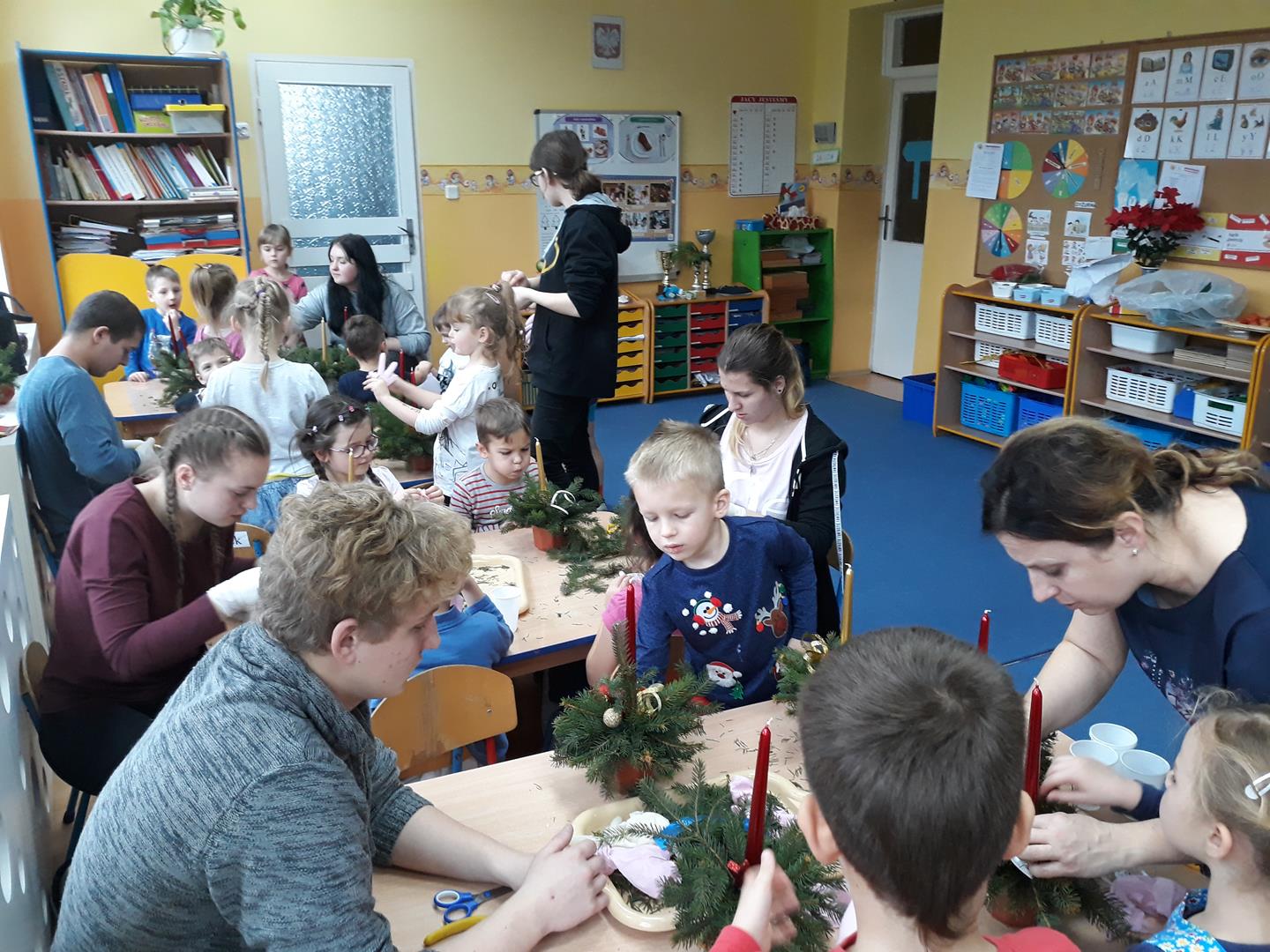 Po raz kolejny, w ramach sąsiedzkiej współpracy, zostaliśmy zaproszeni do Przedszkola Publicznego nr 35 „Krasnala Hałabały” w Szczecinie. Tam, w ramach zajęć praktycznych, przeprowadziliśmy warsztaty florystyczne. Z przygotowanych wcześniej materiałów uczniowie z klasy I TK oraz grupa sześciolatków, wspólnie wykonywali dekoracje świąteczne – stroiki bożonarodzeniowe. Dzieci ze starszymi koleżankami i kolegami tworzyły kolorowe stroiki, które będą zdobiły ich domy podczas świąt. Kiedy wszyscy ukończyli swoje dekoracje, „Skrzaty” razem z panią wychowawczynią podziękowały nam za mile i twórczo spędzony czas. Na koniec wszyscy stanęli do pamiątkowego zdjęcia. Zajęcia odbyły się 19 grudnia 2017 roku.