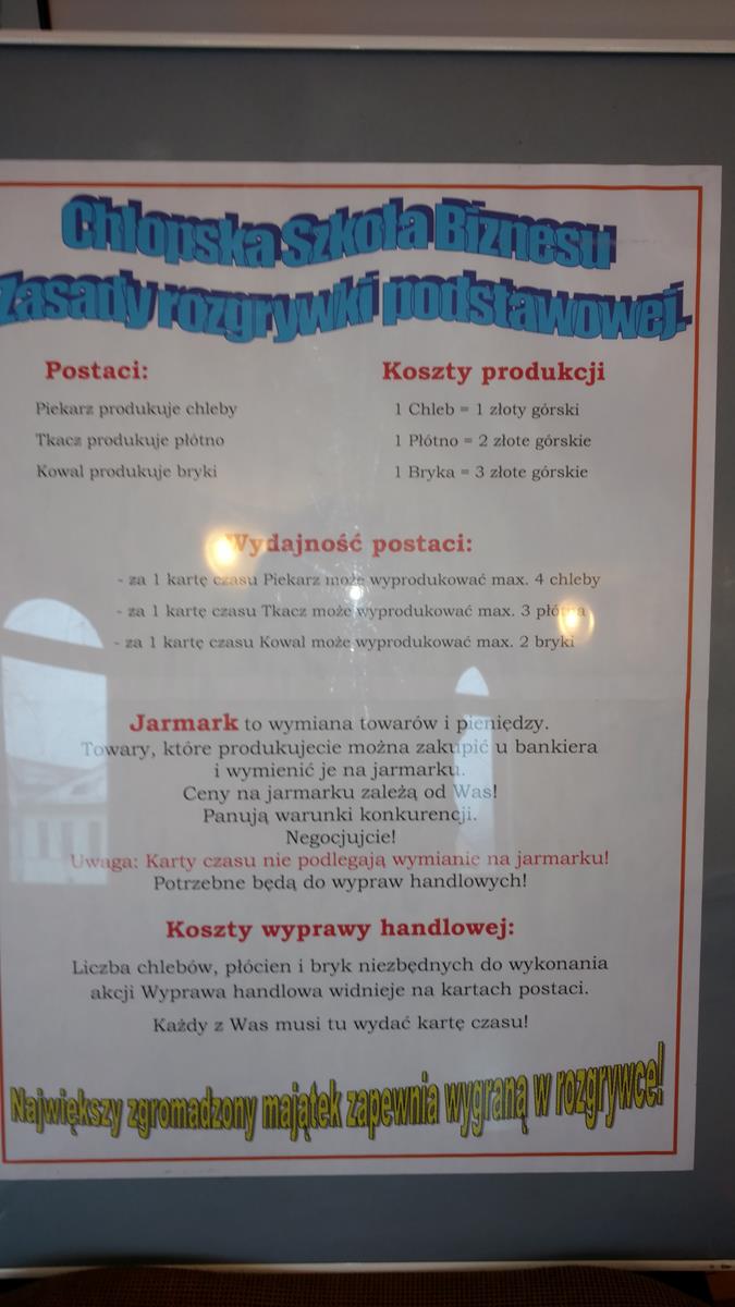 W środę 7 marca uczniowie klasy 2 TW i 2 TK uczestniczyli w grze pt. „Chłopska szkoła biznesu”, która odbyła się w Książnicy Pomorskiej. Gra ta uczy prowadzenia negocjacji, współpracy w grupie, umiejętności nawiązywania kontaktów handlowych, samodzielności w działaniu oraz podejmowania ryzyka w postaci „czarnego rynku”, na którym uczniowie nielegalnie sprzedawali karty czasu – o skutkach działania „czarnego rynku” uczyliśmy się na zajęciach. Każdy mógł się sprawdzić w roli przedsiębiorcy.
