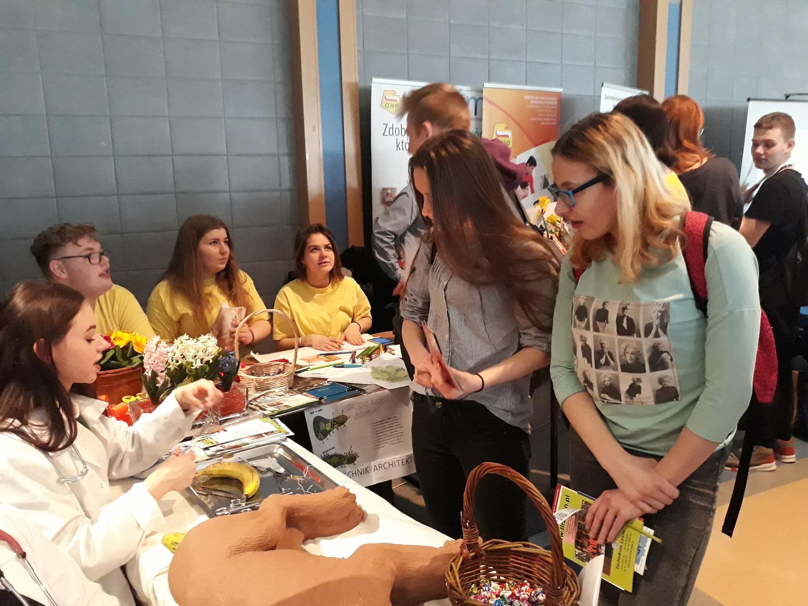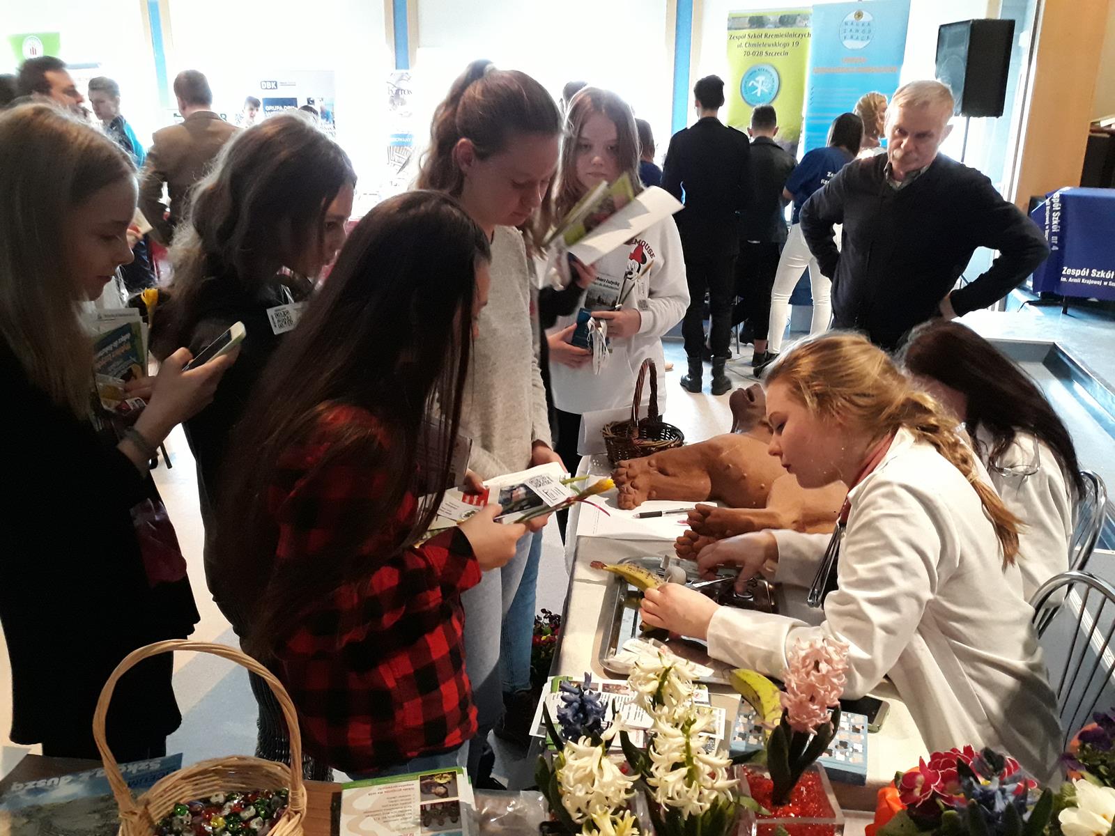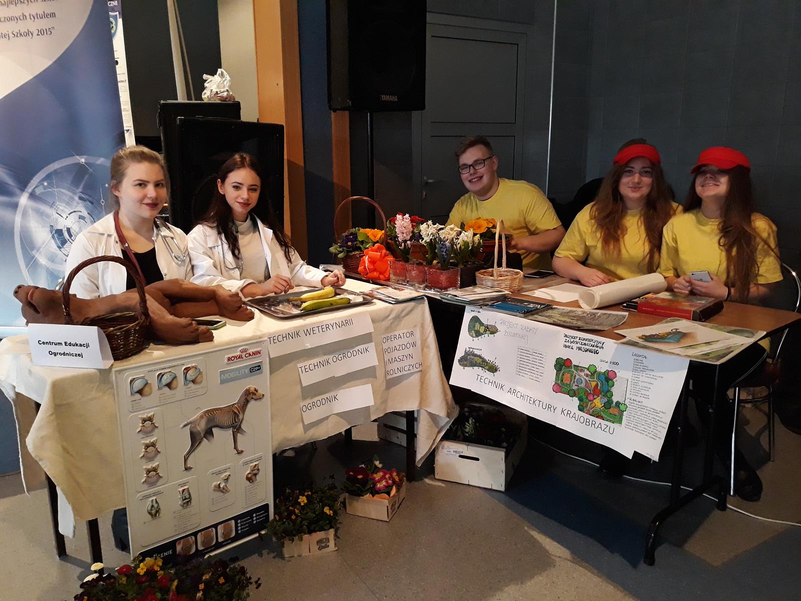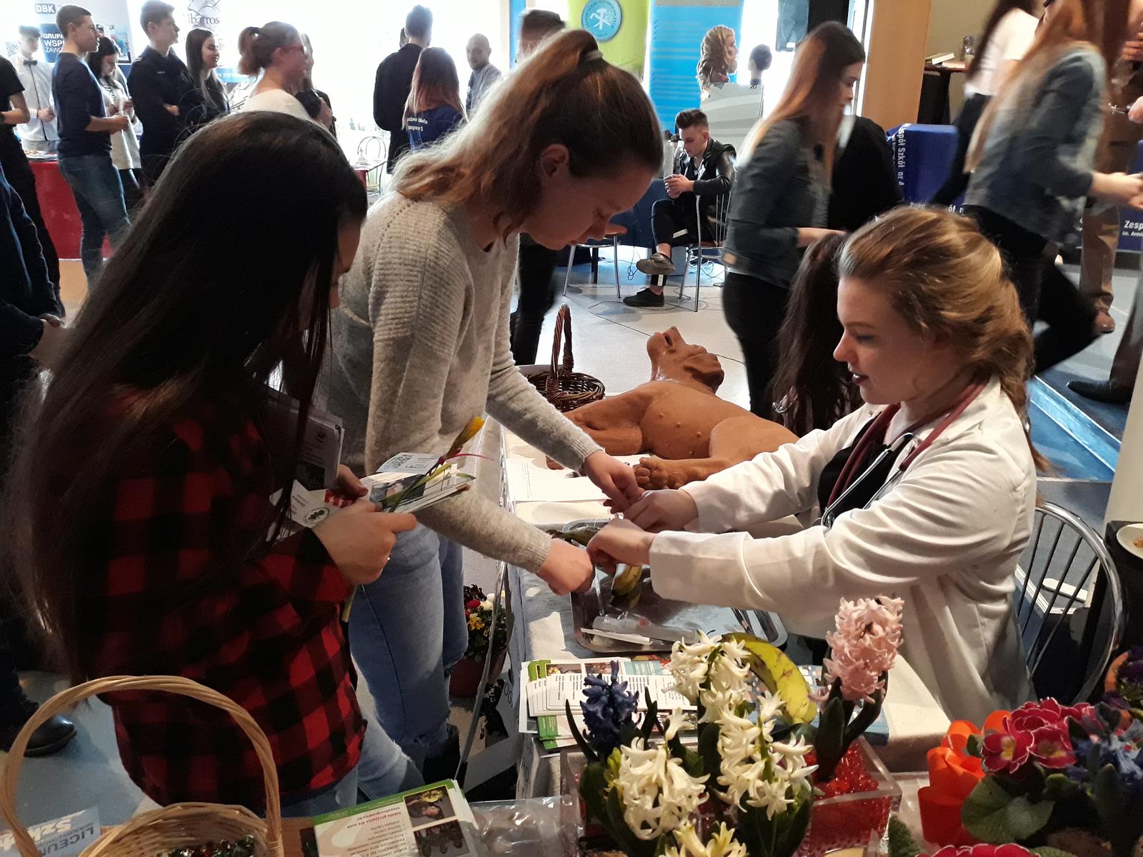 Nasze stanowisko cieszyło się dużym zainteresowaniem. Młodsi koledzy, którzy muszą podjąć trudną decyzję o dalszym kierunku kształcenia, mogli zapoznać się, z czym mogą spotkać się przychodząc do naszej szkoły. „Weterynarze” pokazywali sposoby zszywania ran. Czynność tę wykonywali na bananach i każdy chętny mógł się przekonać czy sprosta temu zadaniu. Ponadto na fantomie psa, mogli nauczyć się resuscytacji. Najbardziej zainteresowani mogli zdobyć dużo więcej cennych informacji związanych z kierunkiem. Byliśmy cierpliwi i na każde pytanie staraliśmy się udzielać pełnej odpowiedzi. „Architekci” pokazali, w jaki sposób tworzone są projekty zagospodarowania terenów zieleni. W ruch poszły kredki, ołówki, ekierki i za chwilę – jak zaczarowane – zaczęły pojawiać się elementy małej architektury, drzewa, oczka wodne itp. Natomiast „ogrodnicy” udzielali instruktażu, w jaki sposób prawidłowo pielęgnować rośliny: sadzić, stosować odpowiednie podłoże, podlewać itp. W pokazie wykorzystano hydrożel w aranżacji ze szklanymi naczyniami, w których zagościły wiosenne kwiaty.
