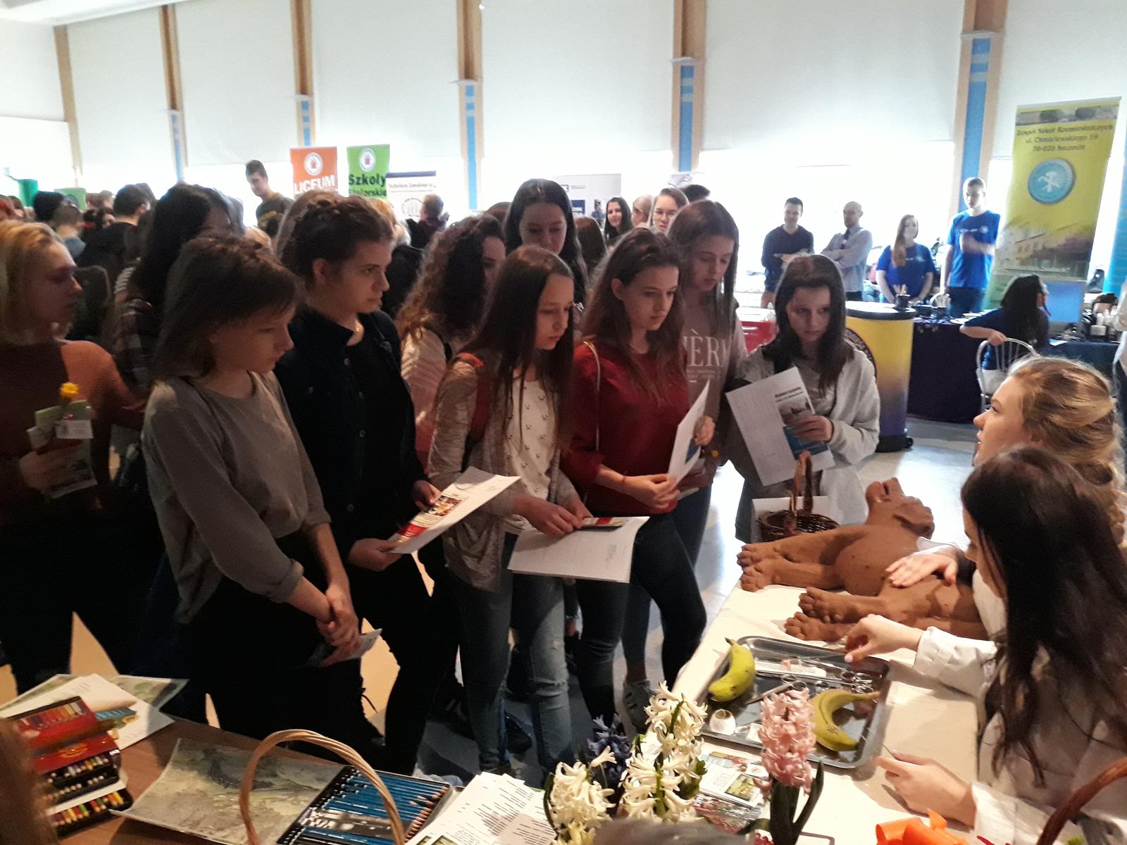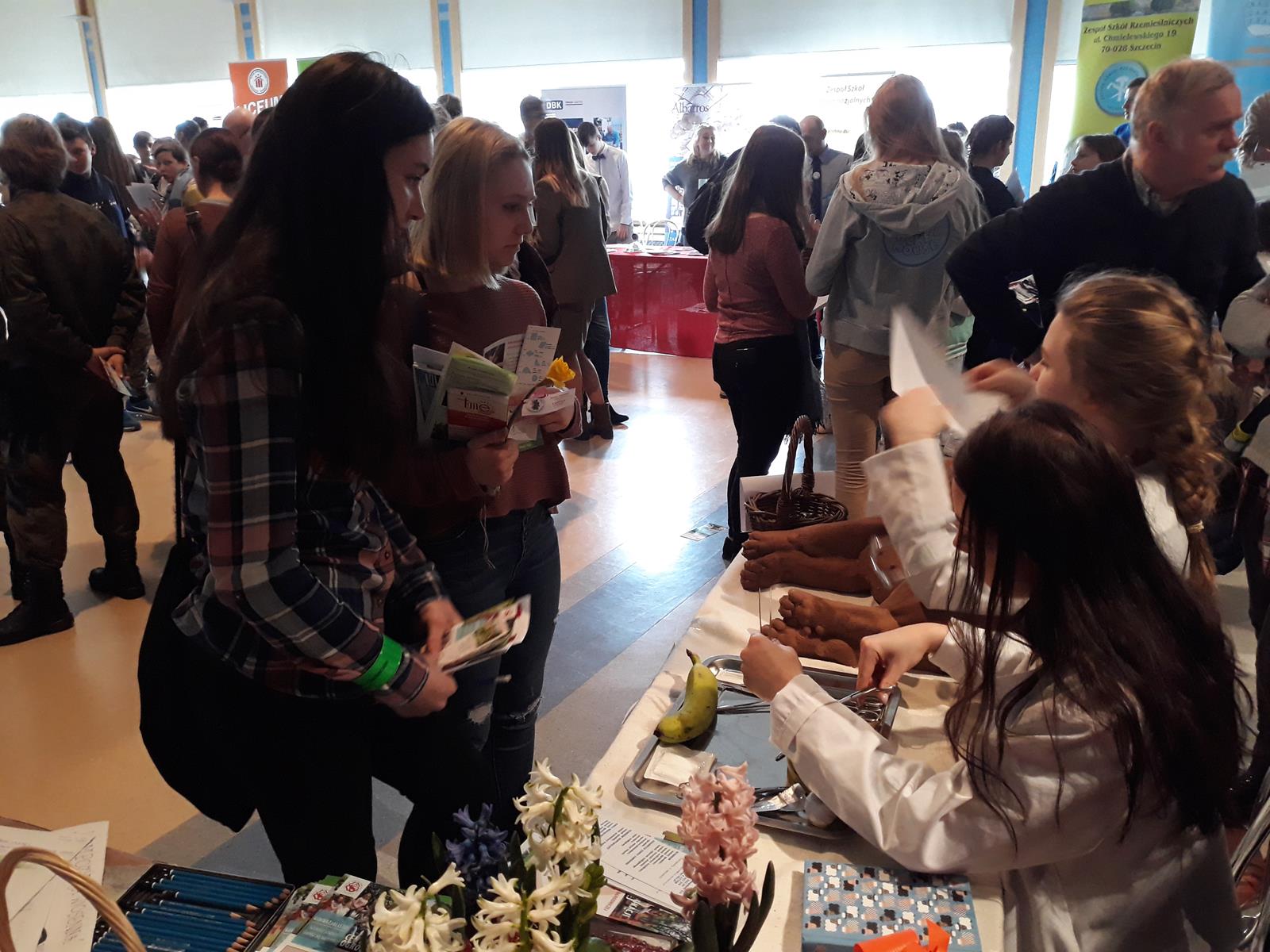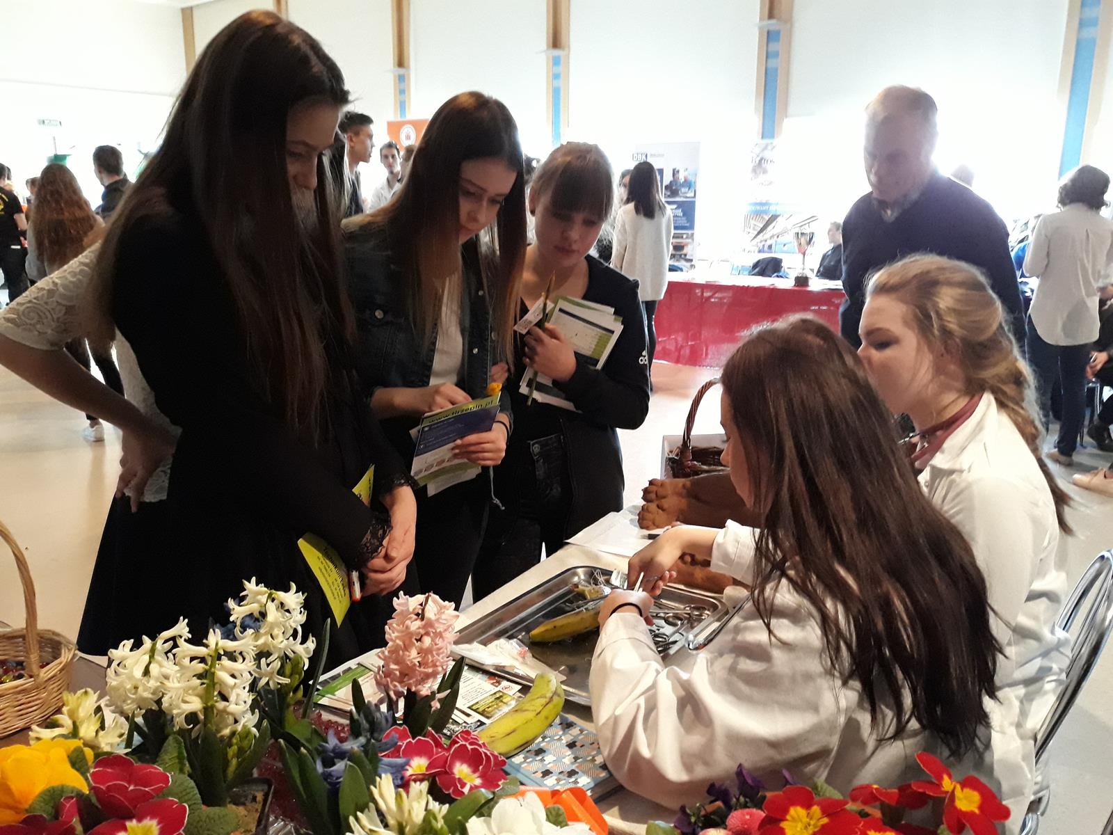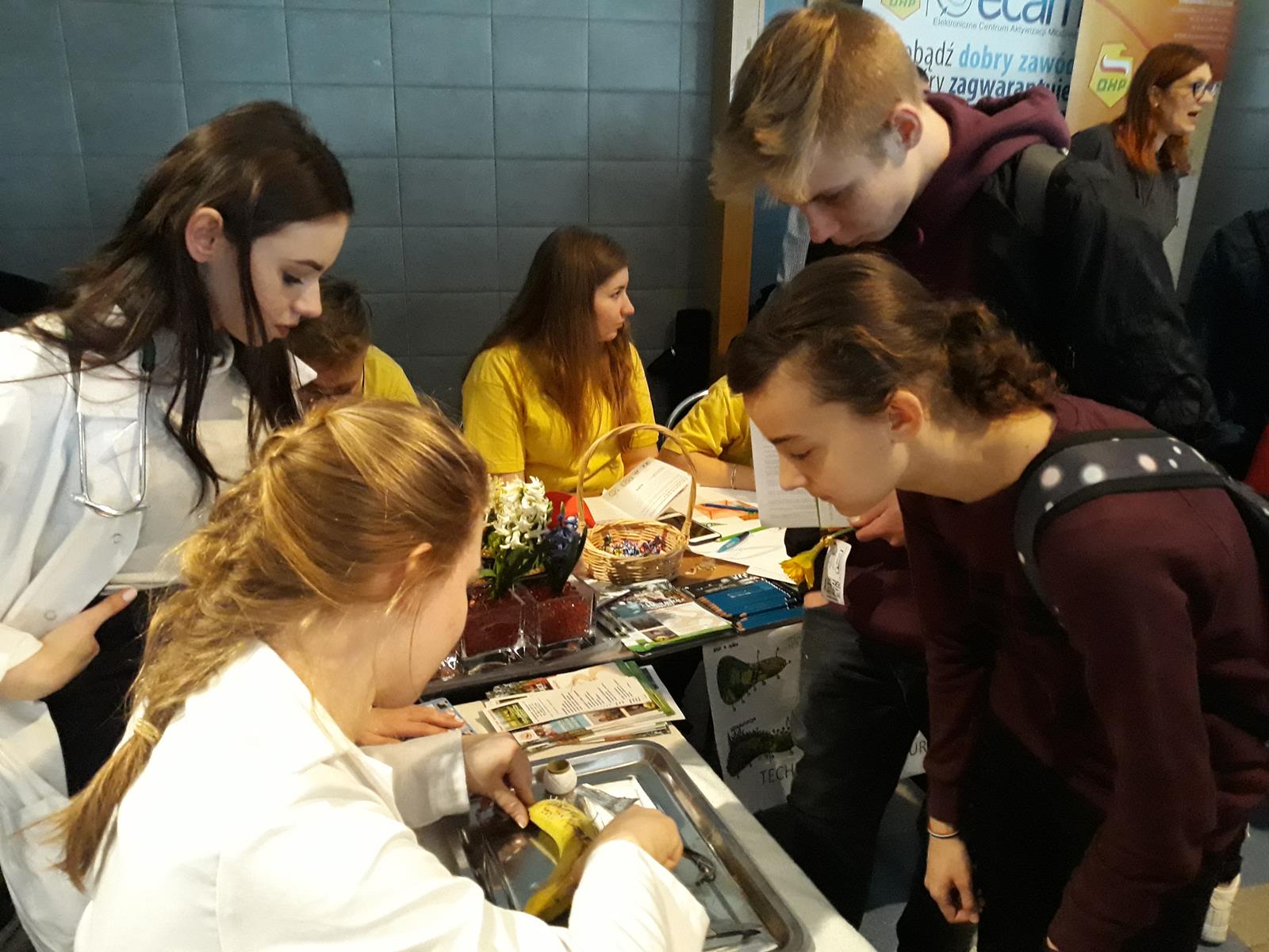 Nasze stanowisko cieszyło się dużym zainteresowaniem. Młodsi koledzy, którzy muszą podjąć trudną decyzję o dalszym kierunku kształcenia, mogli zapoznać się, z czym mogą spotkać się przychodząc do naszej szkoły. „Weterynarze” pokazywali sposoby zszywania ran. Czynność tę wykonywali na bananach i każdy chętny mógł się przekonać czy sprosta temu zadaniu. Ponadto na fantomie psa, mogli nauczyć się resuscytacji. Najbardziej zainteresowani mogli zdobyć dużo więcej cennych informacji związanych z kierunkiem. Byliśmy cierpliwi i na każde pytanie staraliśmy się udzielać pełnej odpowiedzi. „Architekci” pokazali, w jaki sposób tworzone są projekty zagospodarowania terenów zieleni. W ruch poszły kredki, ołówki, ekierki i za chwilę – jak zaczarowane – zaczęły pojawiać się elementy małej architektury, drzewa, oczka wodne itp. Natomiast „ogrodnicy” udzielali instruktażu, w jaki sposób prawidłowo pielęgnować rośliny: sadzić, stosować odpowiednie podłoże, podlewać itp. W pokazie wykorzystano hydrożel w aranżacji ze szklanymi naczyniami, w których zagościły wiosenne kwiaty.