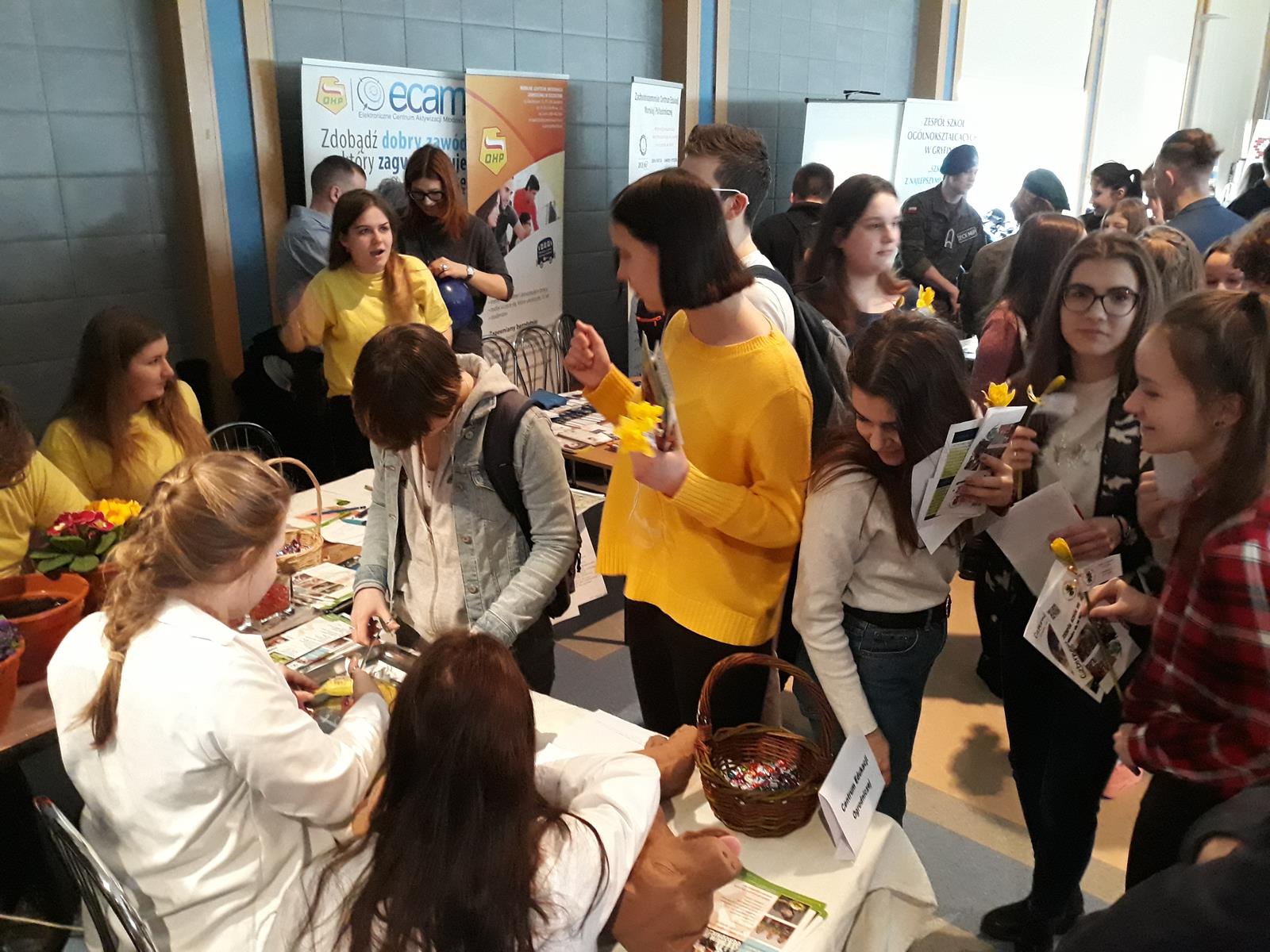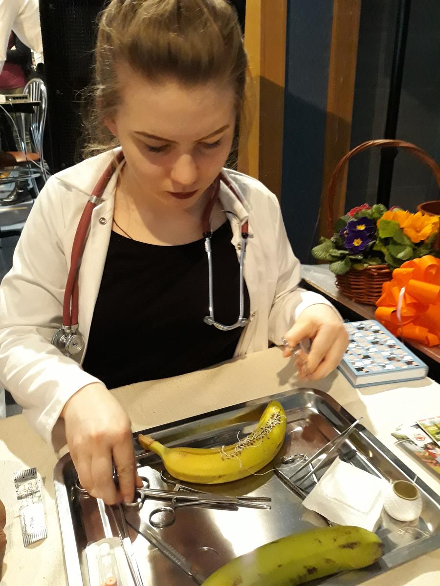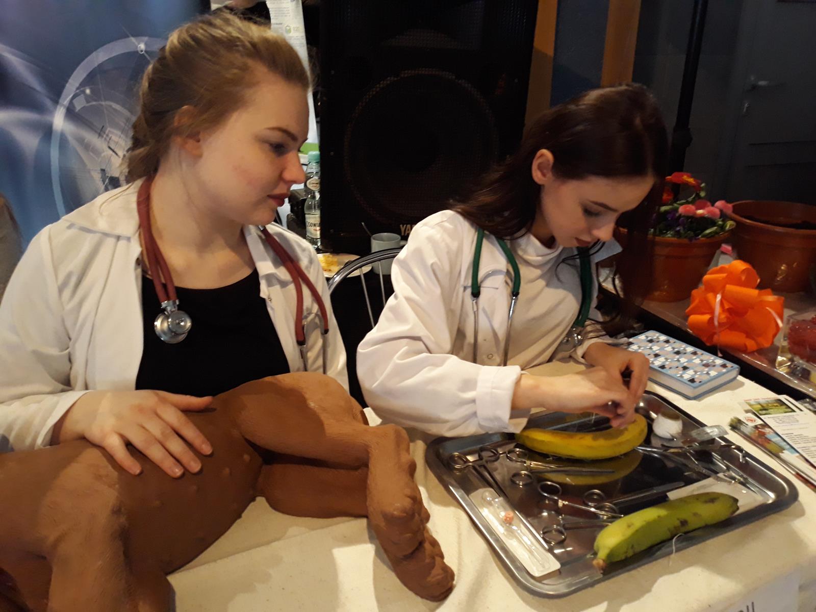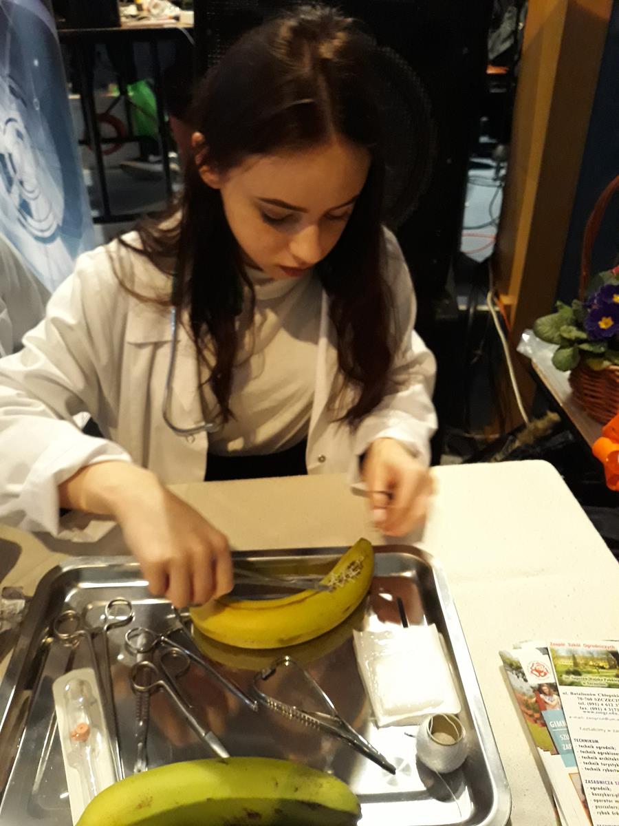 Nasze stanowisko cieszyło się dużym zainteresowaniem. Młodsi koledzy, którzy muszą podjąć trudną decyzję o dalszym kierunku kształcenia, mogli zapoznać się, z czym mogą spotkać się przychodząc do naszej szkoły. „Weterynarze” pokazywali sposoby zszywania ran. Czynność tę wykonywali na bananach i każdy chętny mógł się przekonać czy sprosta temu zadaniu. Ponadto na fantomie psa, mogli nauczyć się resuscytacji. Najbardziej zainteresowani mogli zdobyć dużo więcej cennych informacji związanych z kierunkiem. Byliśmy cierpliwi i na każde pytanie staraliśmy się udzielać pełnej odpowiedzi. „Architekci” pokazali, w jaki sposób tworzone są projekty zagospodarowania terenów zieleni. W ruch poszły kredki, ołówki, ekierki i za chwilę – jak zaczarowane – zaczęły pojawiać się elementy małej architektury, drzewa, oczka wodne itp. Natomiast „ogrodnicy” udzielali instruktażu, w jaki sposób prawidłowo pielęgnować rośliny: sadzić, stosować odpowiednie podłoże, podlewać itp. W pokazie wykorzystano hydrożel w aranżacji ze szklanymi naczyniami, w których zagościły wiosenne kwiaty.