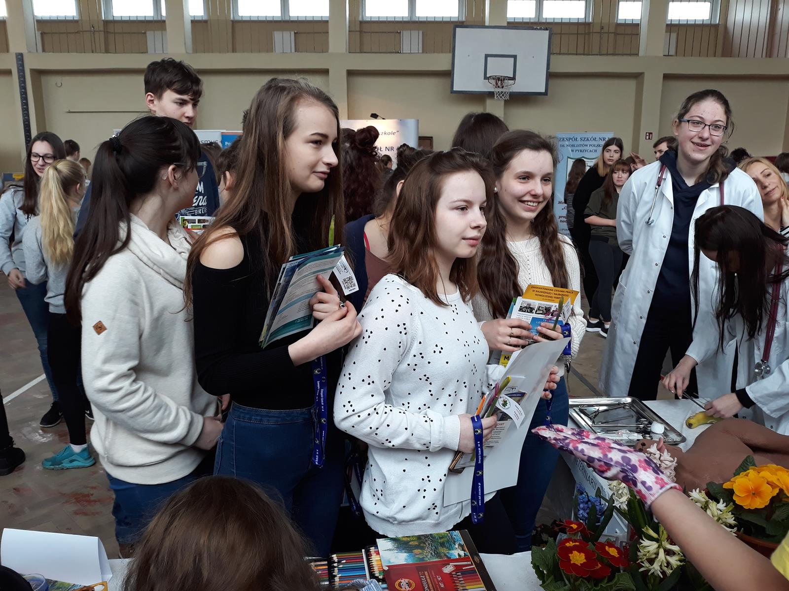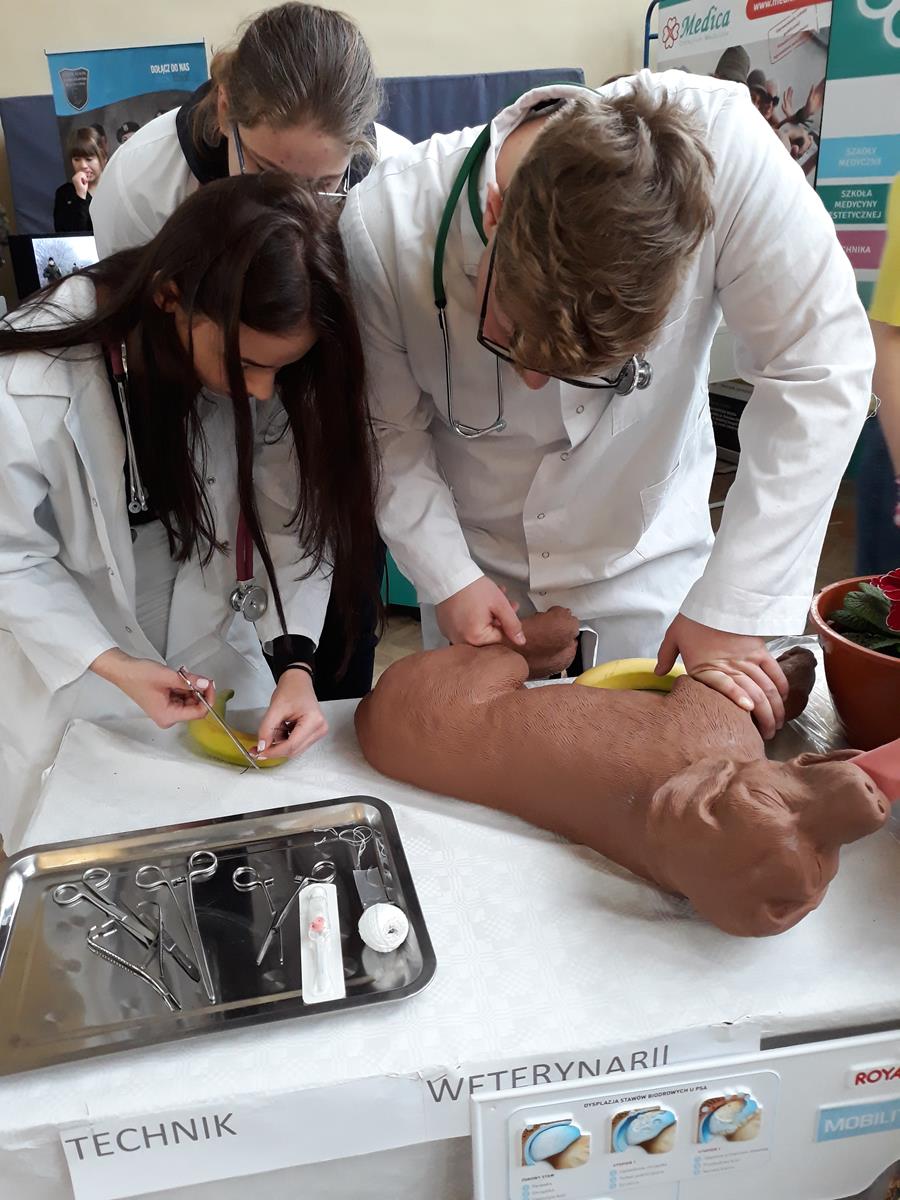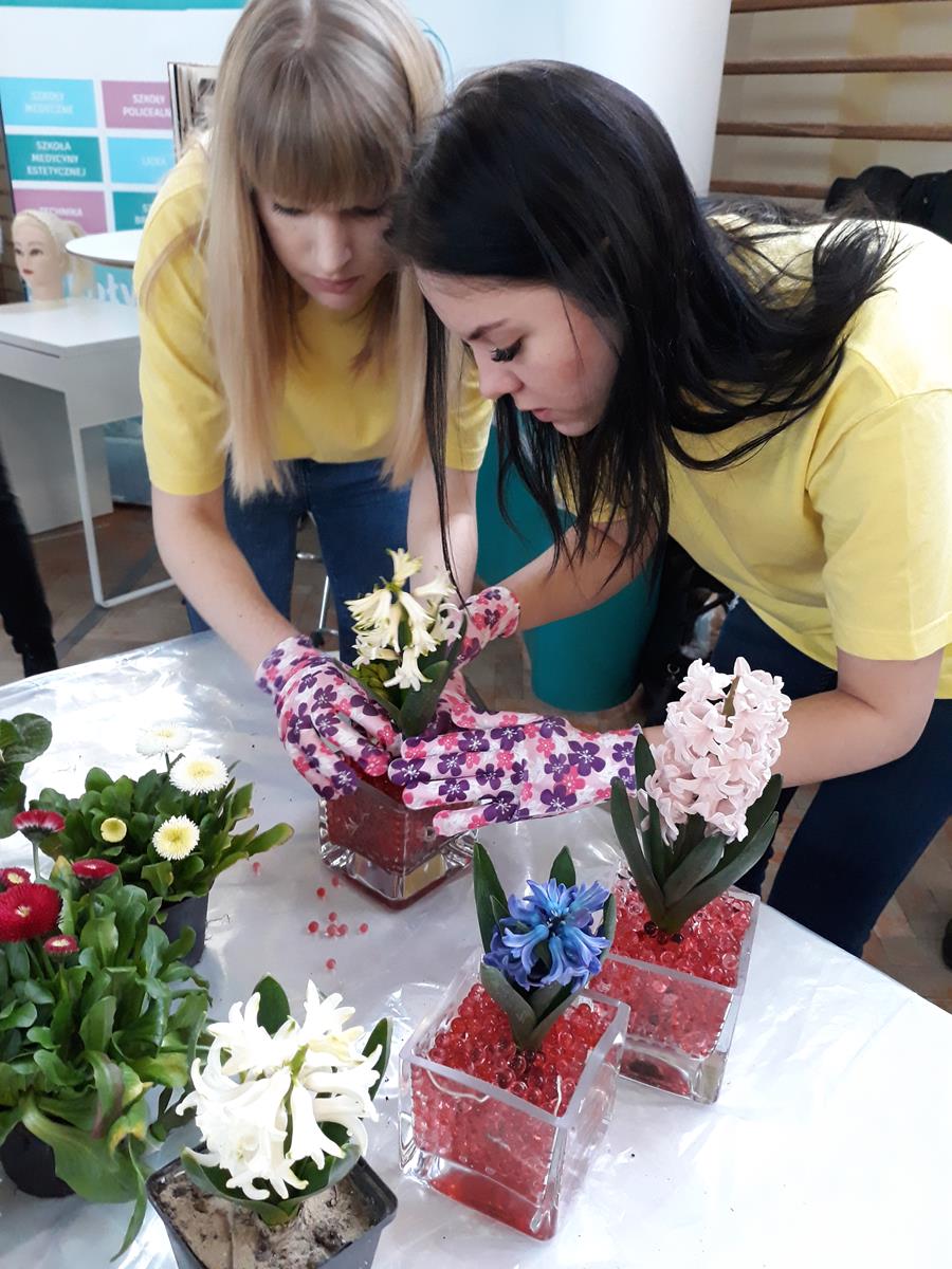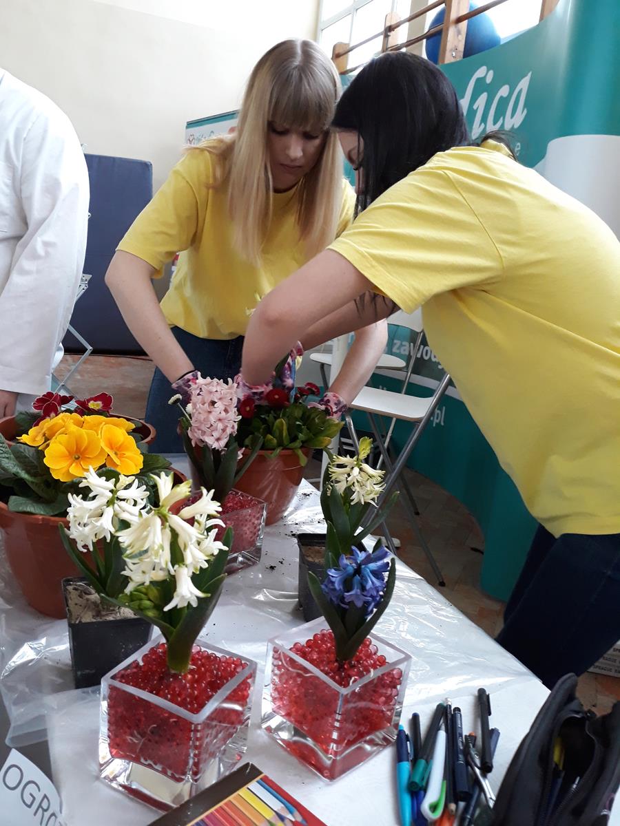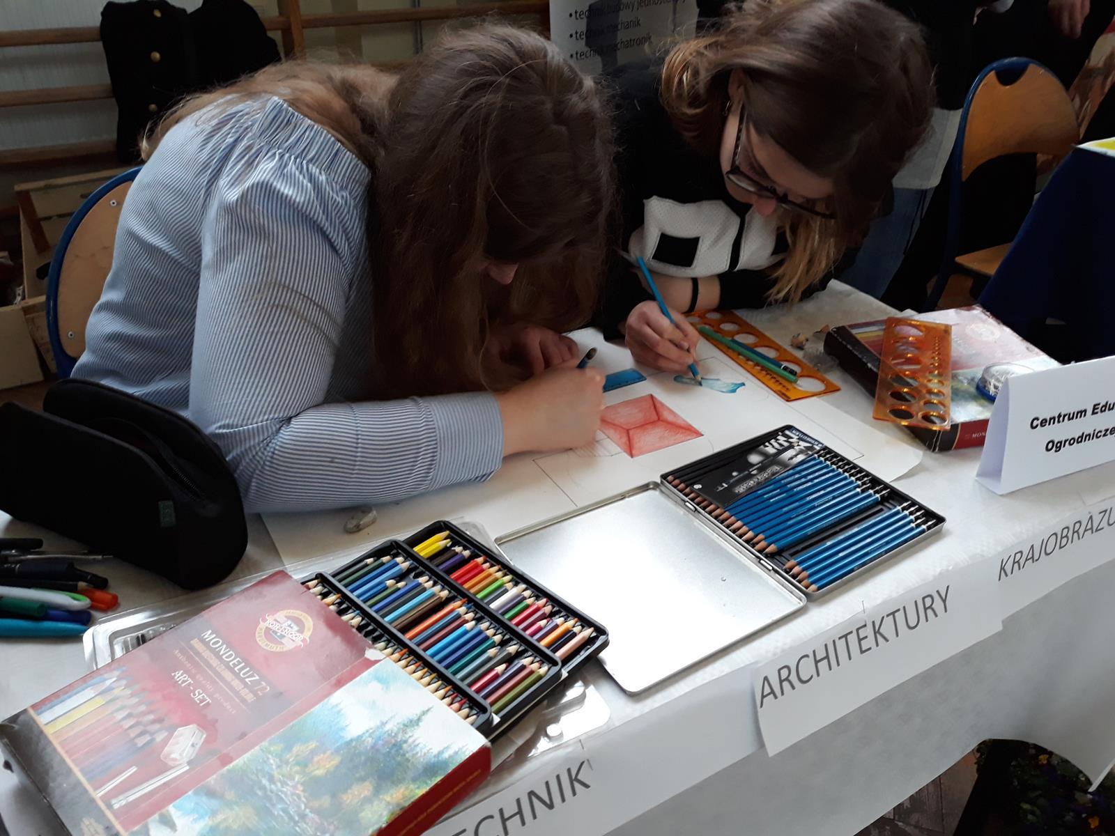 Nasze stoisko przyciągało uwagę młodszych kolegów m.in: obszerną wystawą projektów, opracowanych przez przyszłych, młodych architektów krajobrazu. Podczas targów osoby odwiedzające mogły „na żywo” zobaczyć jak powstaje projekt. Uczennice z Technikum Ogrodniczego sadziły pierwiosnki, stokrotki, bratki i hiacynty w różne podłoża. Opowiadały o zawodzie, o zajęciach praktycznych, praktykach zawodowych, zachęcały zainteresowanych do rozpoczęcia nauki w murach naszej szkoły. Technicy weterynarii zaprezentowali gimnazjalistom profesjonalne szycie chirurgiczne oraz niezbędne do tego narzędzia. Osoby chętne, pod czujnym okiem przyszłych weterynarzy, próbowały założyć szwy.