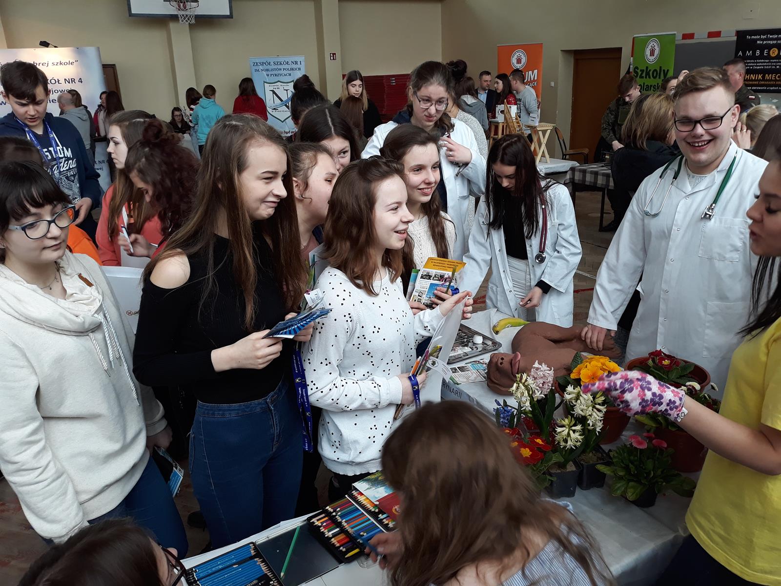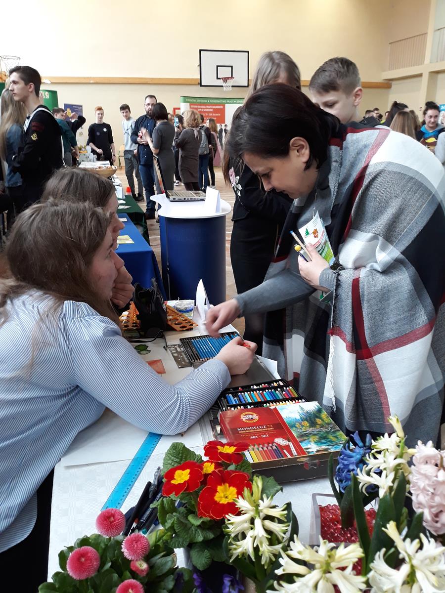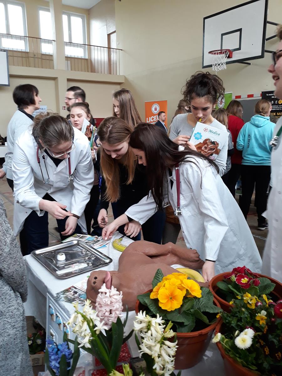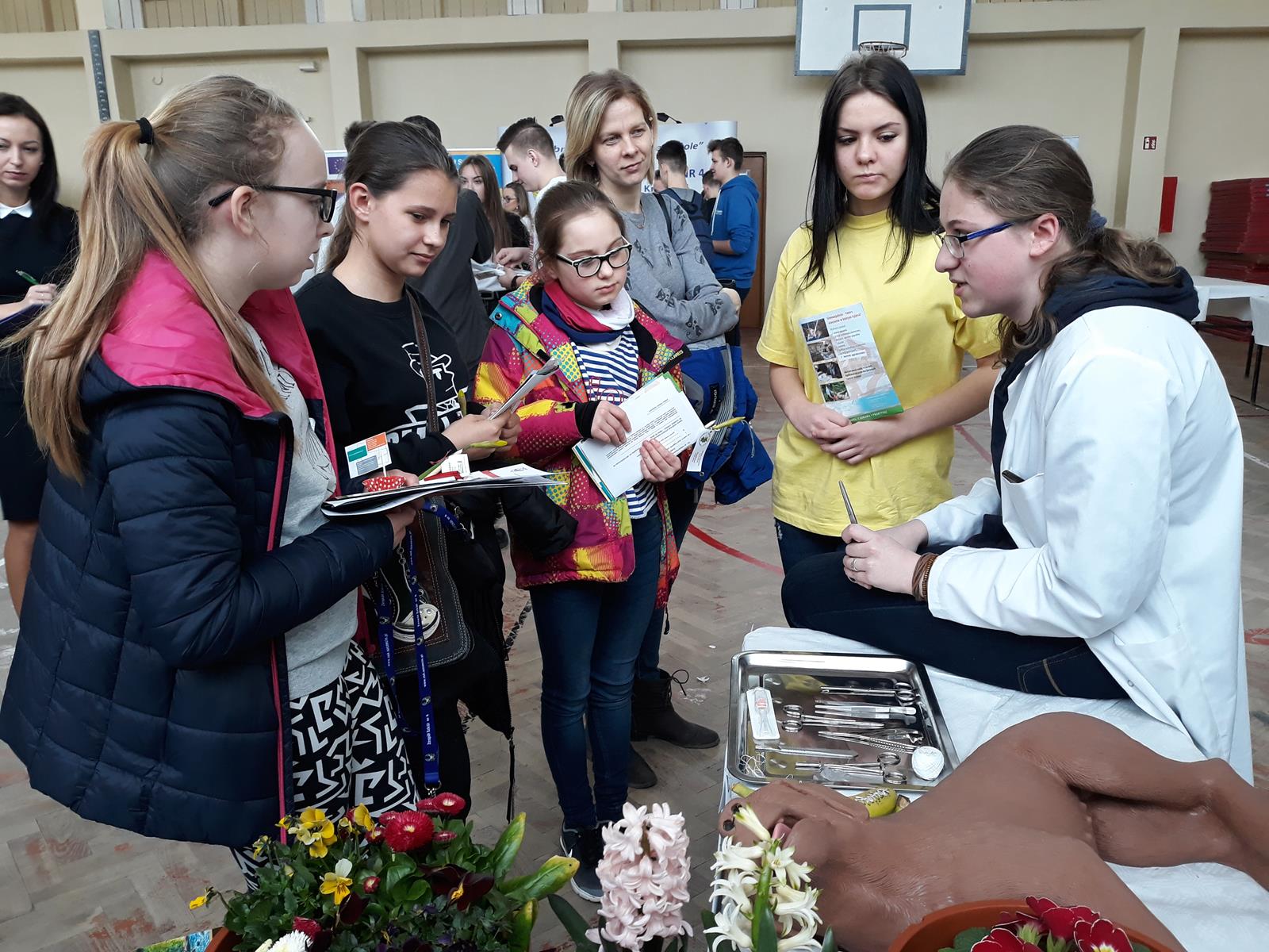 Nasze stoisko przyciągało uwagę młodszych kolegów m.in: obszerną wystawą projektów, opracowanych przez przyszłych, młodych architektów krajobrazu. Podczas targów osoby odwiedzające mogły „na żywo” zobaczyć jak powstaje projekt. Uczennice z Technikum Ogrodniczego sadziły pierwiosnki, stokrotki, bratki i hiacynty w różne podłoża. Opowiadały o zawodzie, o zajęciach praktycznych, praktykach zawodowych, zachęcały zainteresowanych do rozpoczęcia nauki w murach naszej szkoły. Technicy weterynarii zaprezentowali gimnazjalistom profesjonalne szycie chirurgiczne oraz niezbędne do tego narzędzia. Osoby chętne, pod czujnym okiem przyszłych weterynarzy, próbowały założyć szwy.