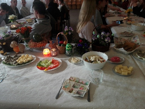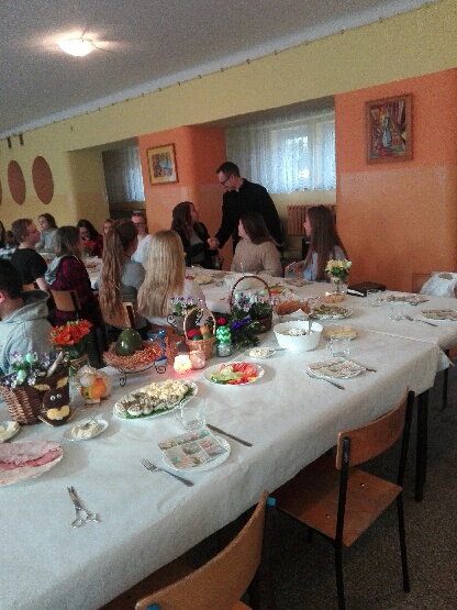 Od kilku lat w naszym internacie szkolnym odbywa się spotkanie z okazji nadchodzących Świat Wielkanocnych. Wbrew tradycji – nie jest to śniadanie, a kolacja, dzięki czemu wszyscy mogą zasiąść do wspólnego biesiadowania. I tak w tym roku 27 marca, przy pięknie udekorowanym palmami, bukszpanem i koszyczkami stole, odbyła się w naszej szkole uroczysta wieczerza z okazji Świąt Wielkiej Nocy. Na wstępie Pani Dyrektor Lila Pławińska powitała wszystkich obecnych w tym wyjątkowym dniu. Następnie jeden z wychowanków przybliżył zwyczaje, obrzędy ludowe i symbole wielkanocne. Ksiądz Przemysław Marek złożył życzenia cudownych Świąt Wielkanocnych, po których wszyscy dzielili się symbolicznie jajkiem, życząc sobie radosnych Świąt Zmartwychwstania Pańskiego. Uroczysta kolacja ubarwiona była konkursami na najładniejszy symbol wielkanocny (zwyciężył zajączek) i kraszanki. Na końcu Pani Dyrektor i ksiądz zaskoczyli nas śmigusem-dyngusem. Było sympatycznie, bardzo odświętnie i wesoło.