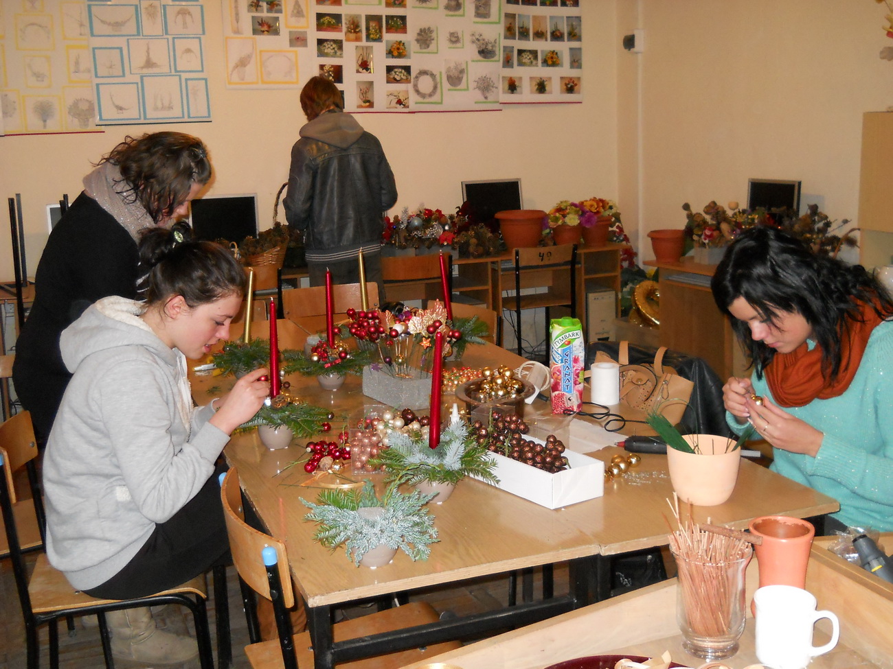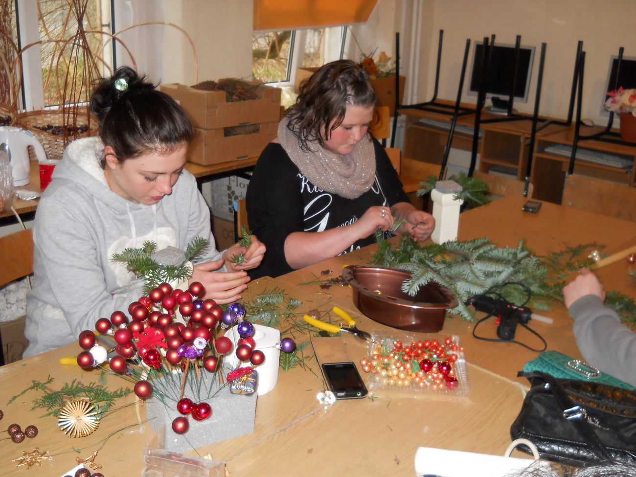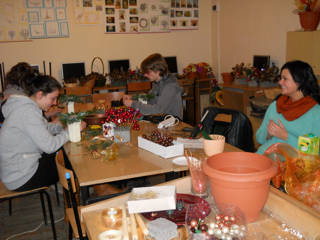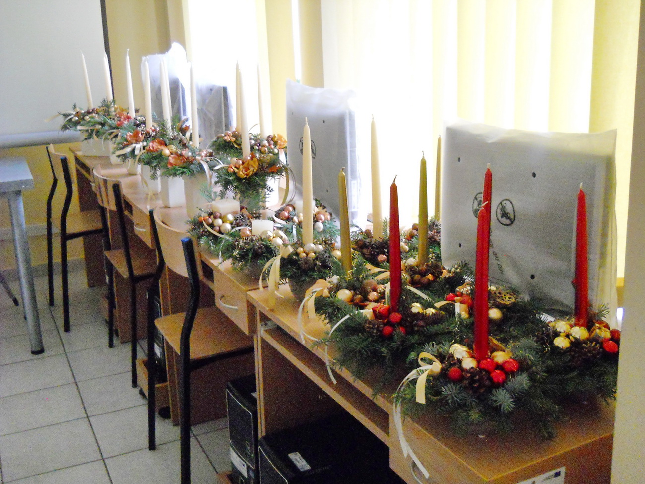 Grudzień to wyjątkowy miesiąc. Najpierw oczekujemy na świętego Mikołaja i szukamy pod poduszką choćby małego prezentu, później przygotowujemy się do świąt. Wykonujemy ozdoby świąteczne, wieńce adwentowe i stroiki bożonarodzeniowe z szyszek, orzechów, ciekawych pędów, które zbieramy latem i jesienią. Tak było i w tym roku. Do wykonywania dekoracji świątecznych przygotowywaliśmy się dużo wcześniej. Wszystkie pozyskane materiały wykorzystujemy między innymi podczas zajęć koła florystycznego. W ramach tych warsztatów młodzież przygotowuje materiały, podkleja druty florystyczne i wykałaczki do suszu egzotycznego, bombek, szyszek, gwiazdek i innych ozdób. Wszyscy uczą się osadzania świec, farbowania ozdobnych elementów. Tak przygotowane materiały umieszczane są w stroikach, w których podstawę stanowi igliwie, głównie jodła, świerk i jałowiec, a centralne miejsce zajmuje świeca. Ważna jest też barwa. Jest ona bowiem jednym z podstawowych elementów składowych kompozycji florystycznej. Za jej pomocą można wyrazić przesłanie oraz wywołać różne emocje. W naszych kompozycjach w tym roku dominują odcienie ecru, beżu, miedzi i brązu. Dzięki połączeniu ze sobą wielu elementów stroiki mają niepowtarzalny klimat.