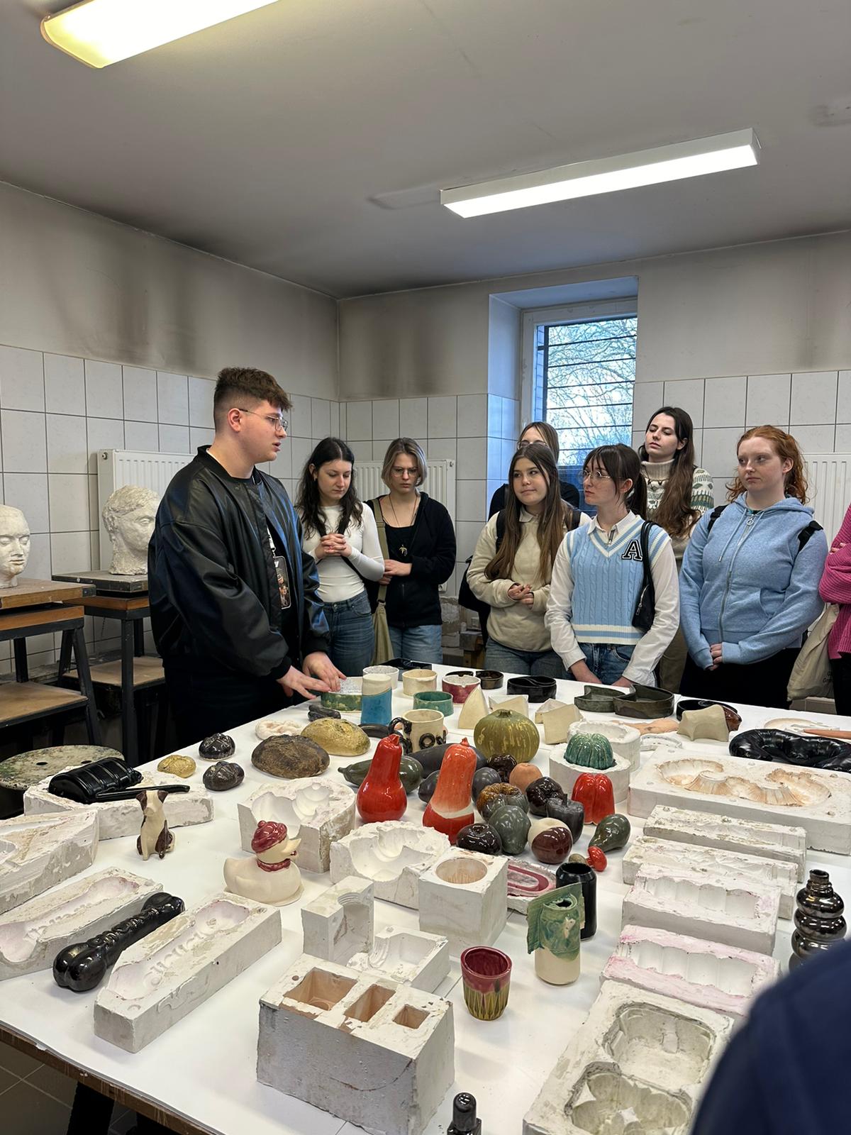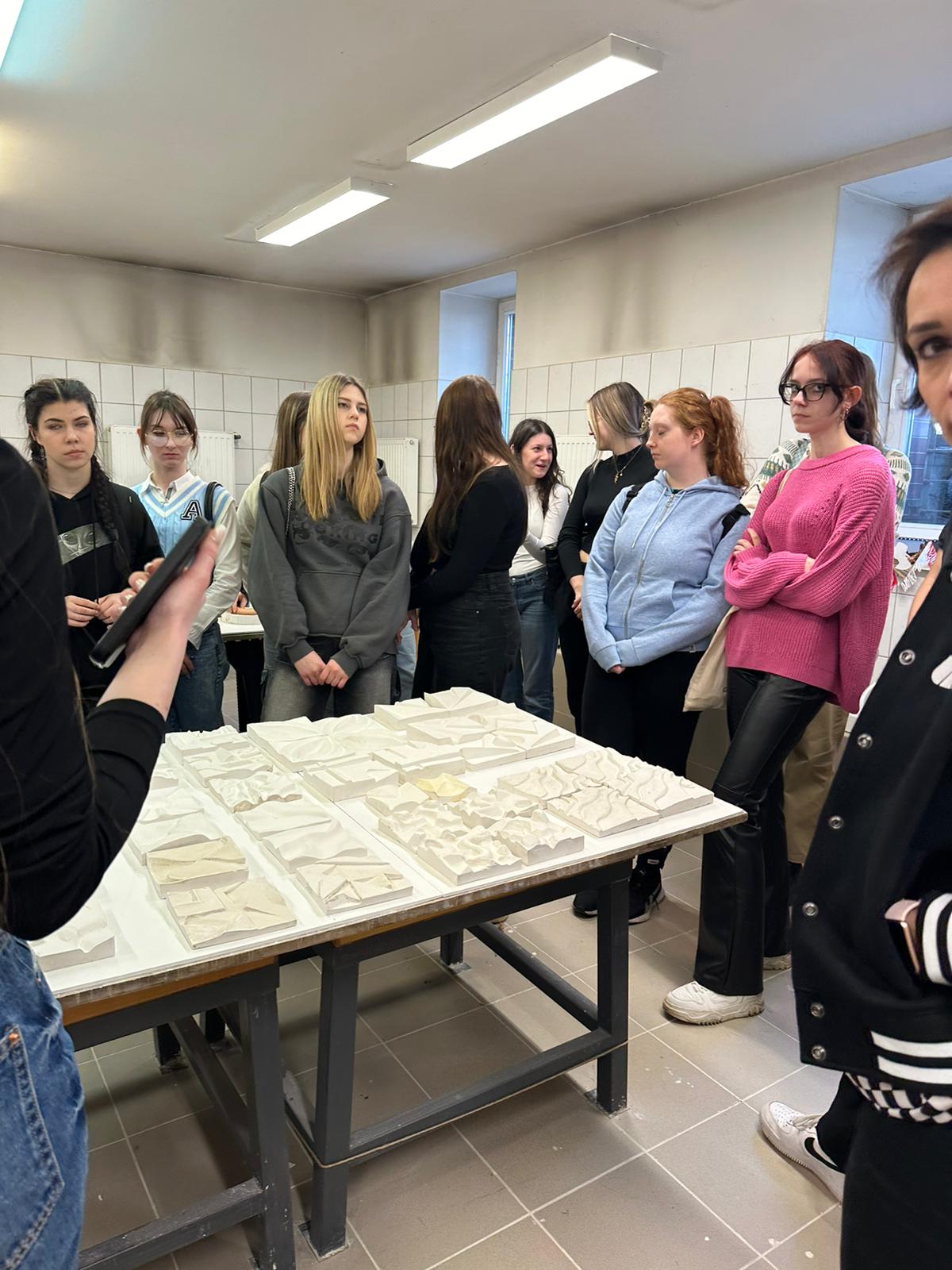 Następnym przystankiem tego dnia była wizyta na Wydziale Architektury. Mieliśmy możliwość obserwacji efektów pracy studentów w postaci projektów, rysunków, obrazów, rzeźb. Zwiedziliśmy pracownie projektowe z najnowszym sprzętem i oprogramowaniem oraz symulatorem, za pomocą którego można wejść do zaprojektowanego wnętrza i sprawdzić np. ergonomię rozmieszczenia mebli i urządzeń.
